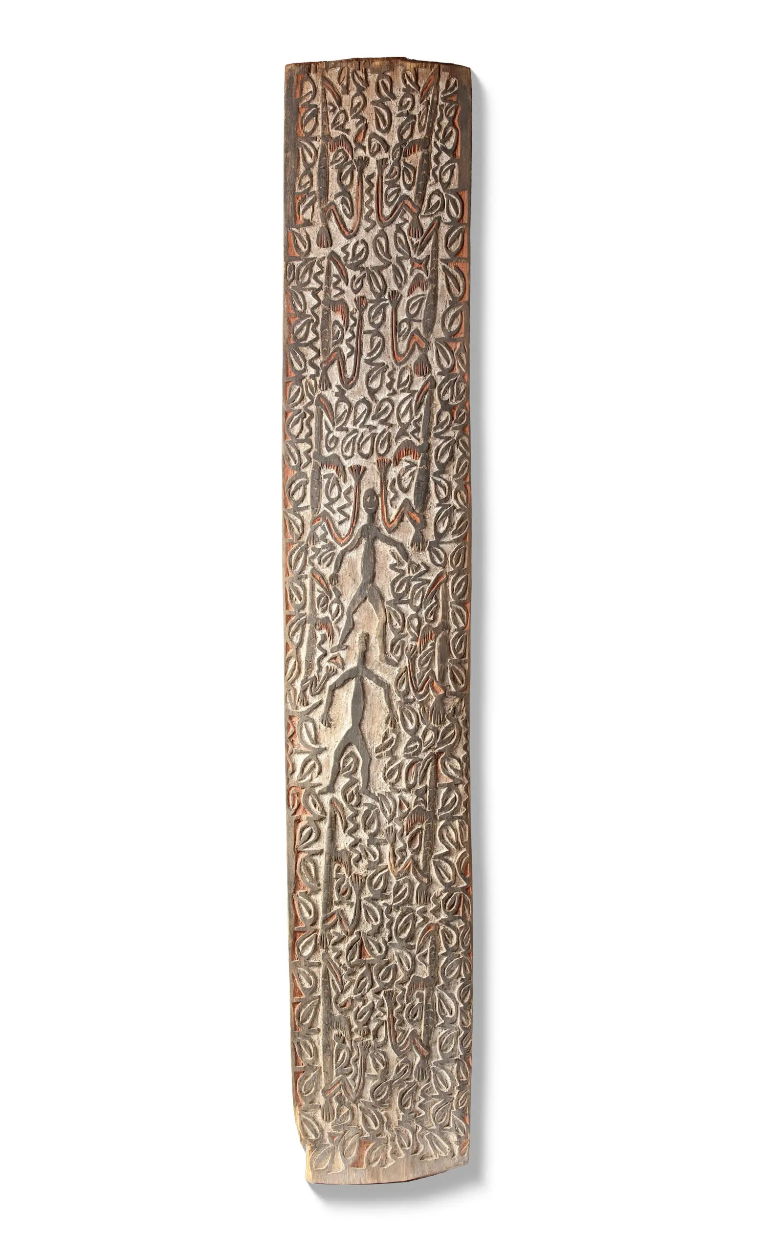 Impressive Asmat panel from southwest Papua (Indonesia), richly carved in relief with typical figural motifs and original painting in black, white and red pigment.