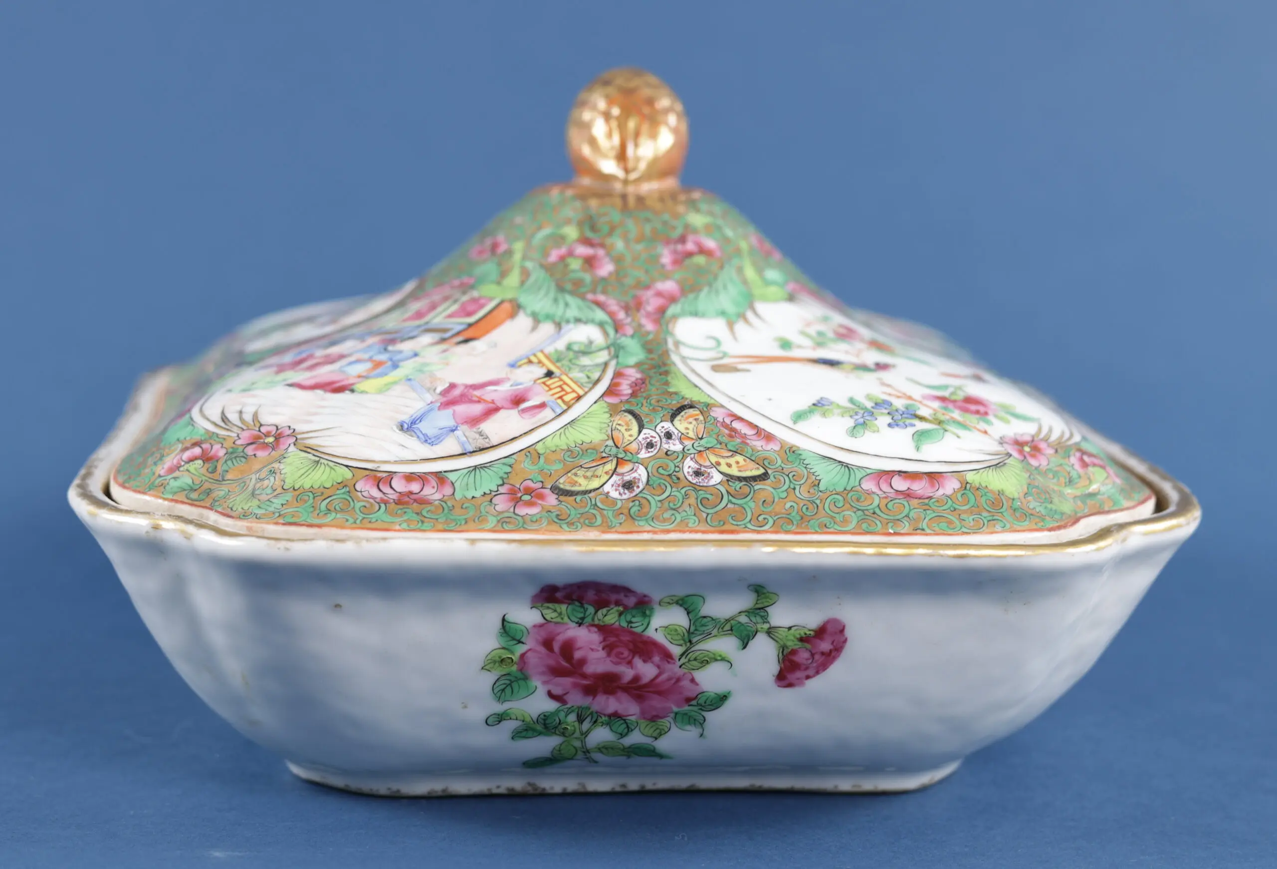 This magnificent bowl was made in Canton, an important centre for exporting Chinese porcelain in the 19th century. The decoration is typical of the famous famille rose style, with exuberant scenes of court ladies, flowering peonies, colourful birds and butterflies. Both the lid and the inside are fully painted, making this object not only functional, but also a luxurious showpiece in the dining room or drawing room. The gold knob on the lid reinforces the aura of richness and refinement that made Canton porcelain loved by collectors worldwide.