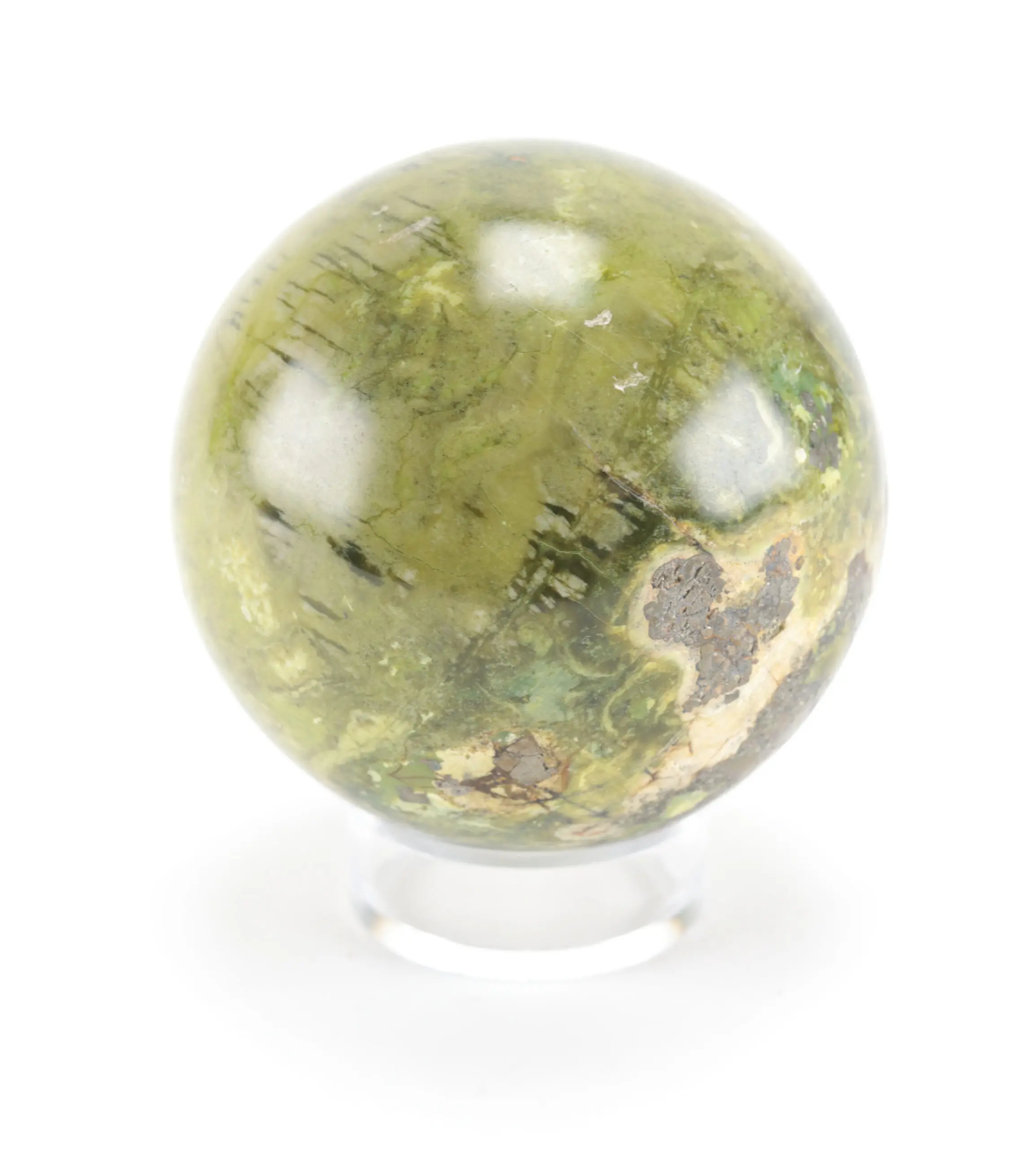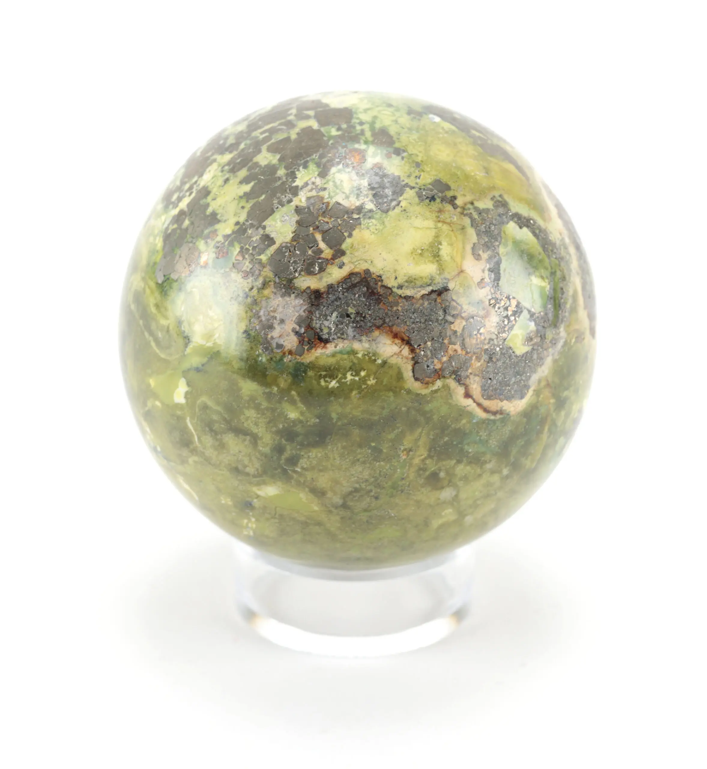 A characterful green Jasper sphere with brilliant pyrite inclusions - this 862-gram Wunderkammer mineral displays a beautiful play of moss-green hues, breccia patterns and metallic pyrite flakes. A sphere with powerful appearance and unique texture.