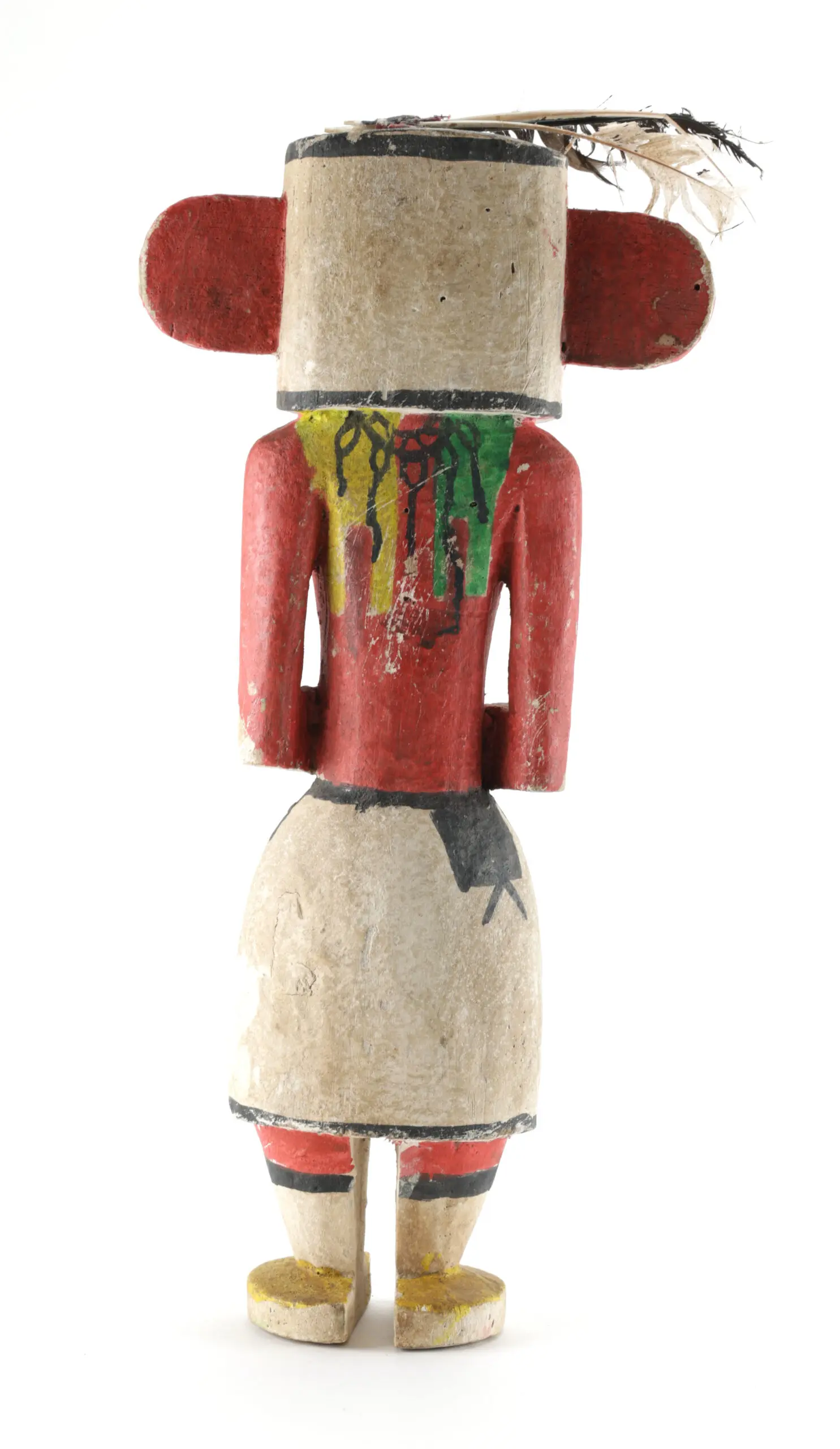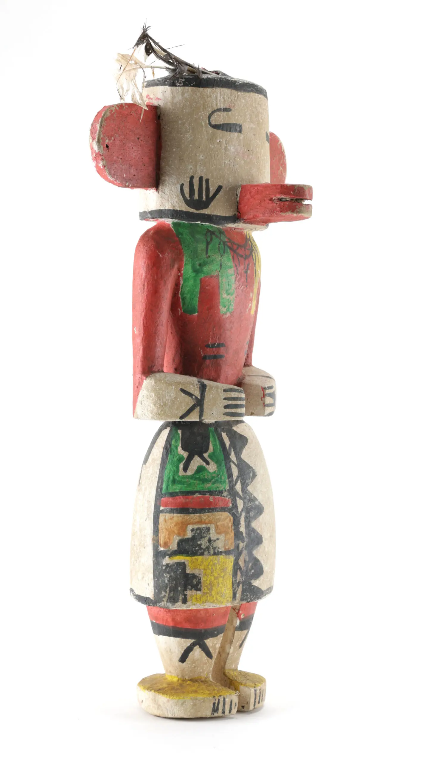 Hopi Hemis kachina (variant) with handprints and original feather. This statue exudes power and tradition, with red disc ears, a cylindrical head and black handprints on the cheeks. The colourful kilt with zigzag and cloud motifs and the feather on top add to its vibrancy.