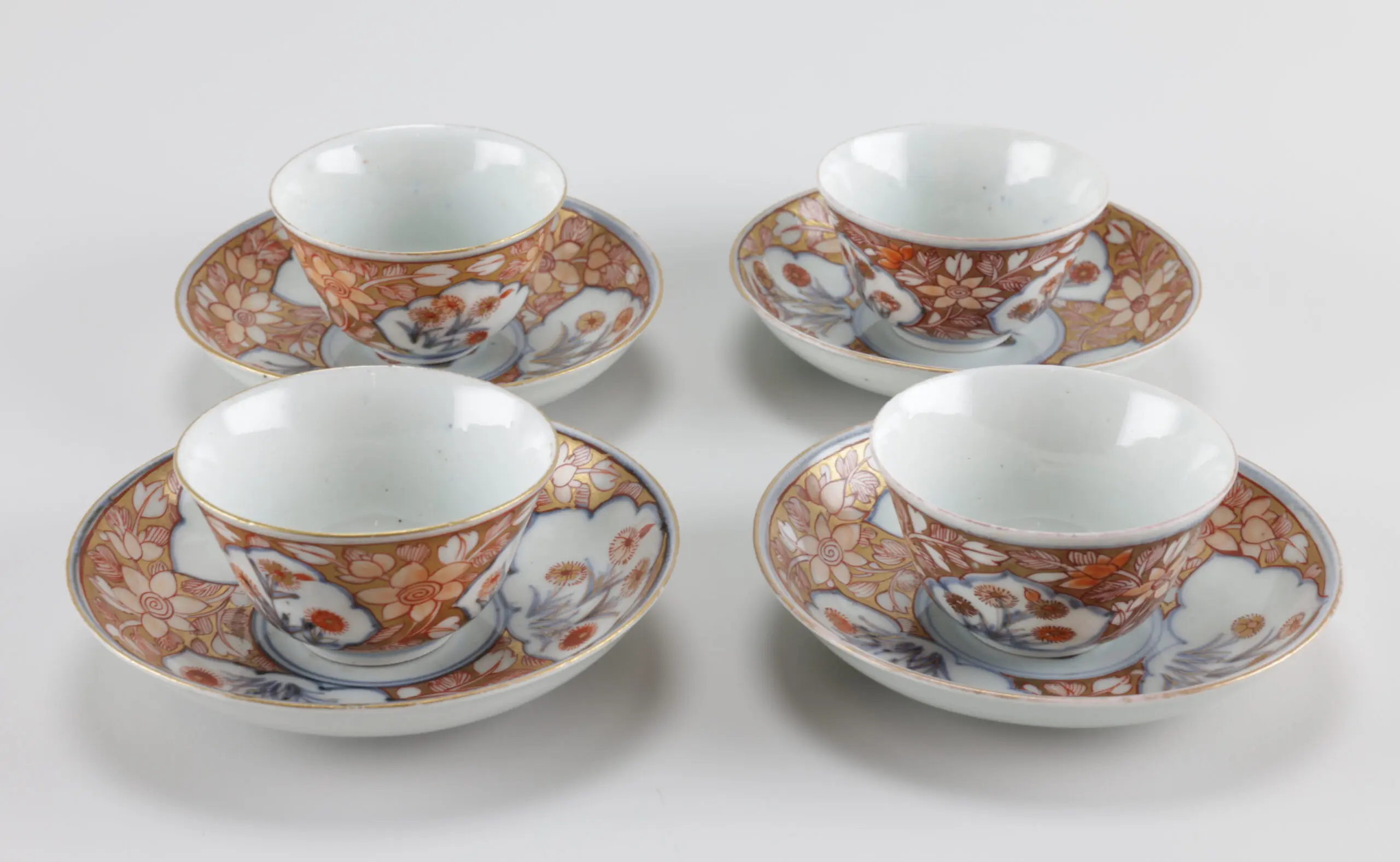 Early Imari class with sparkling red-gold: set of four tea bowls with saucers from the Qianlong period.