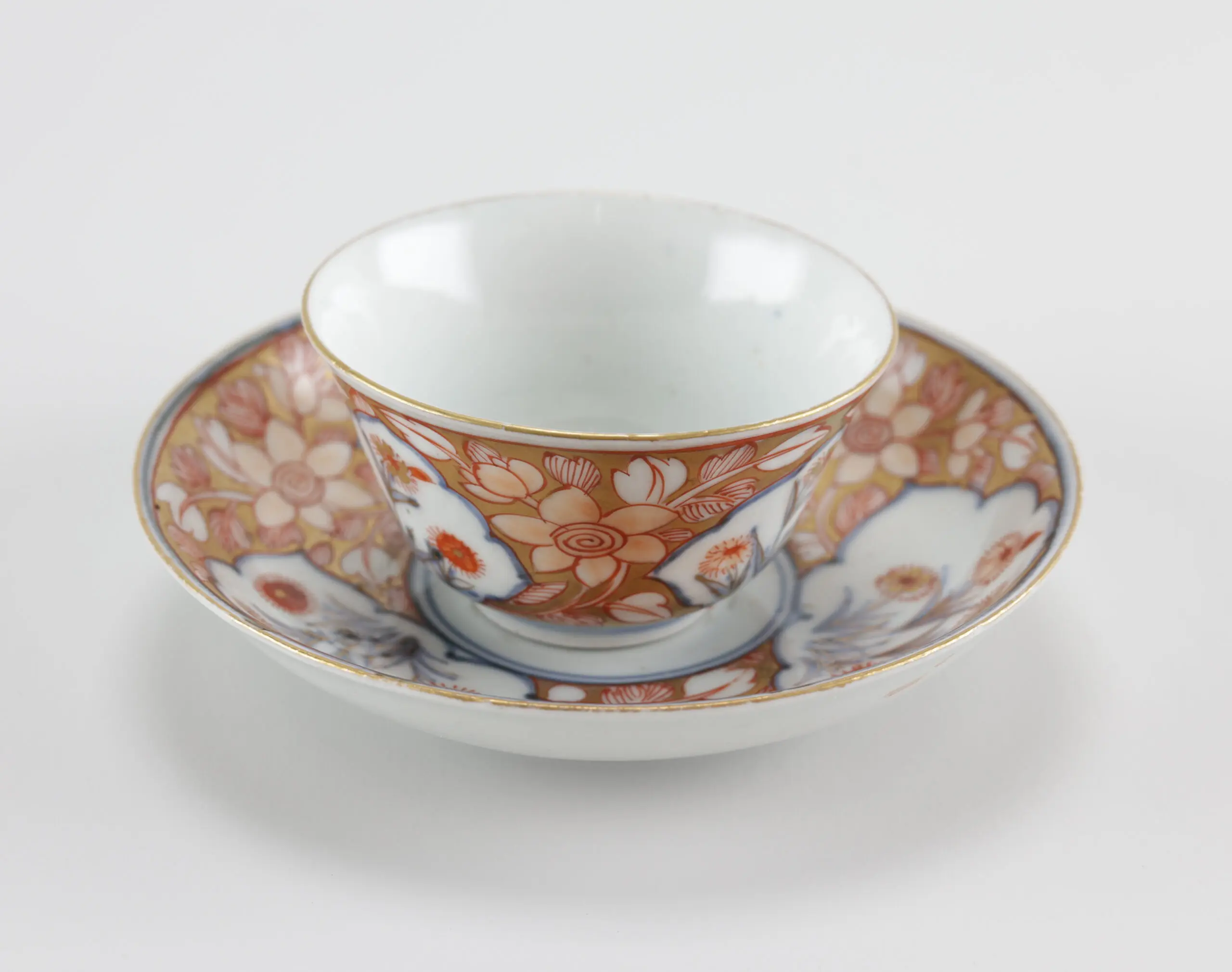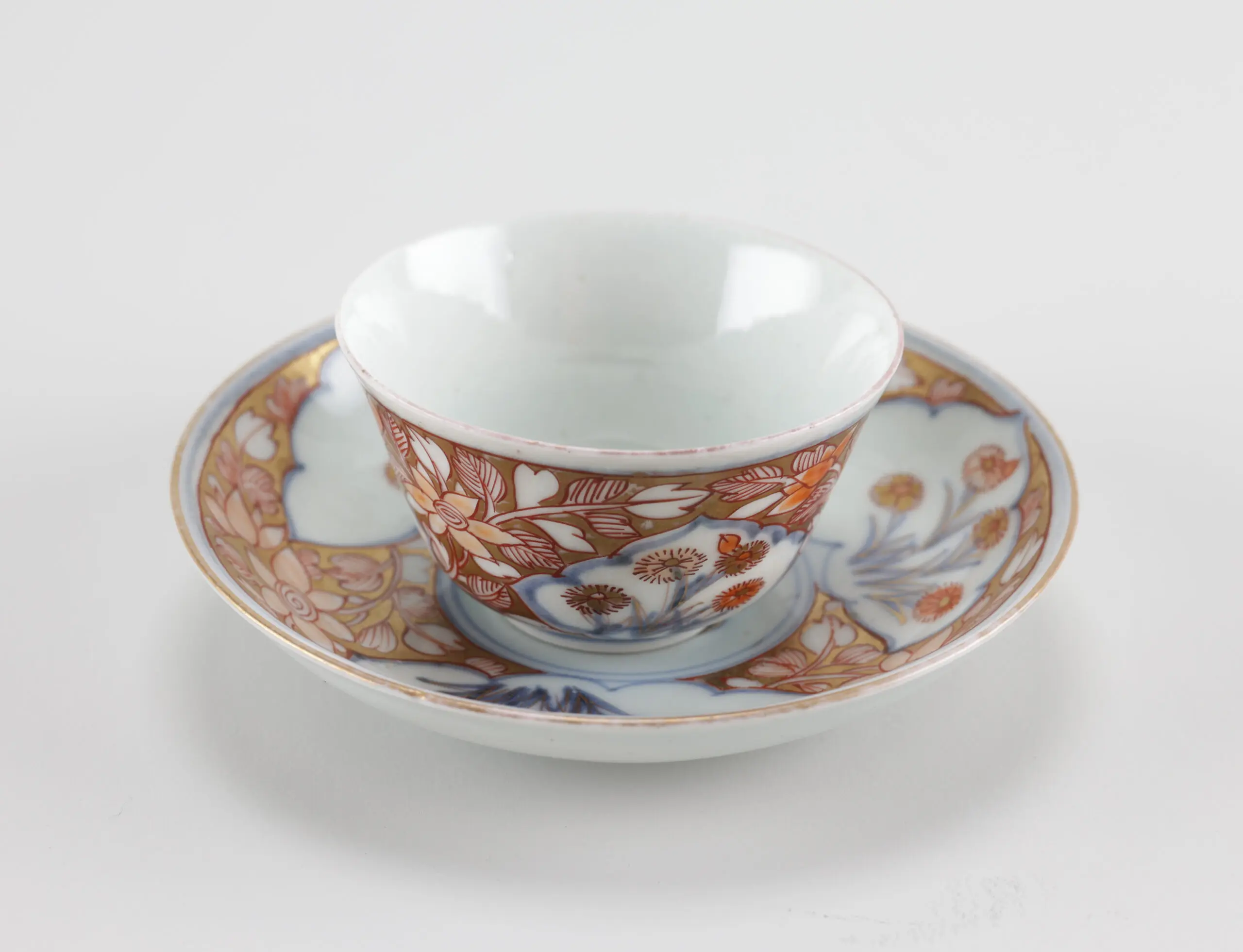 This elegant set embodies the beloved Imari-style: iron red, cobalt blue and gold in vibrant floral and spare decor, executed on fine Chinese export porcelain for the European market in the 18th century. The combination of matching bowls and saucers makes this a striking ensemble for the display case or thematic Imari presentation. The painting shows nice contrasts between full colour areas and white cut-out cartouches, exactly what collectors in Qianlong-Imari appreciate.