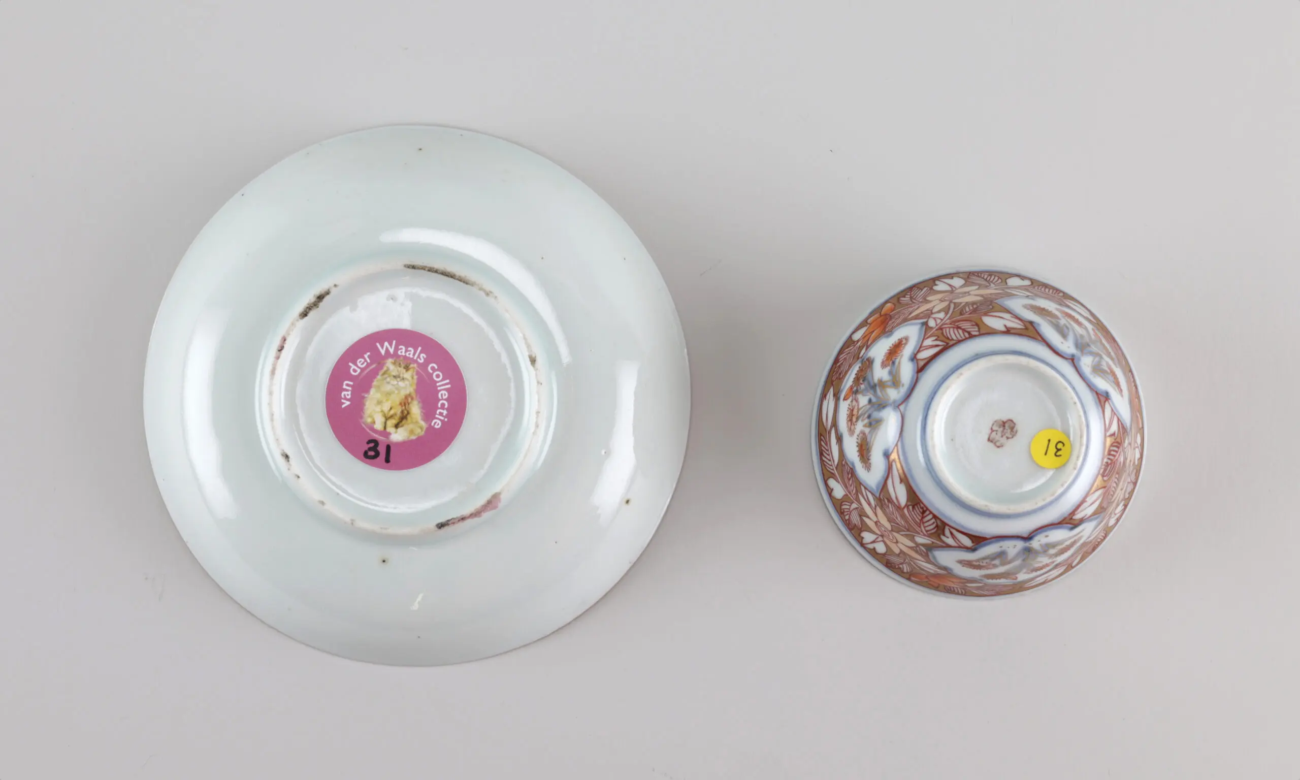 Dimensions. Bowls: Ø 7.5 cm, h. 4 cm. Saucers: Ø 12 cm, h. 2.5 cm.