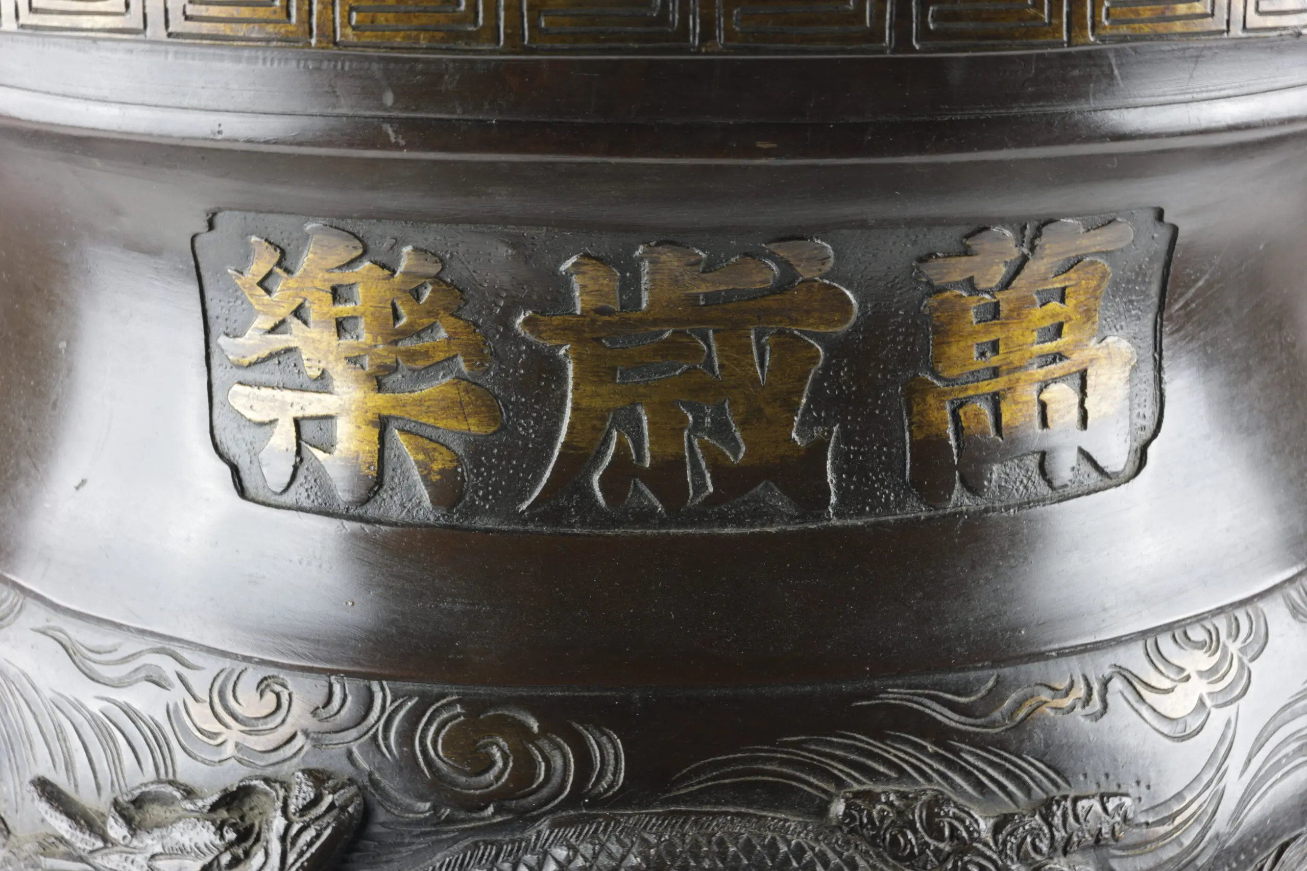 This monumental censer displays a richly elaborate relief of writhing dragons among clouds and waves, symbolising power and prosperity. The handles and legs are designed as foo dogs, exuding vigilance and protection. On the front are gilded Chinese characters: 萬壽樂 (wan shou le), which stands for "eternal happiness and long life".