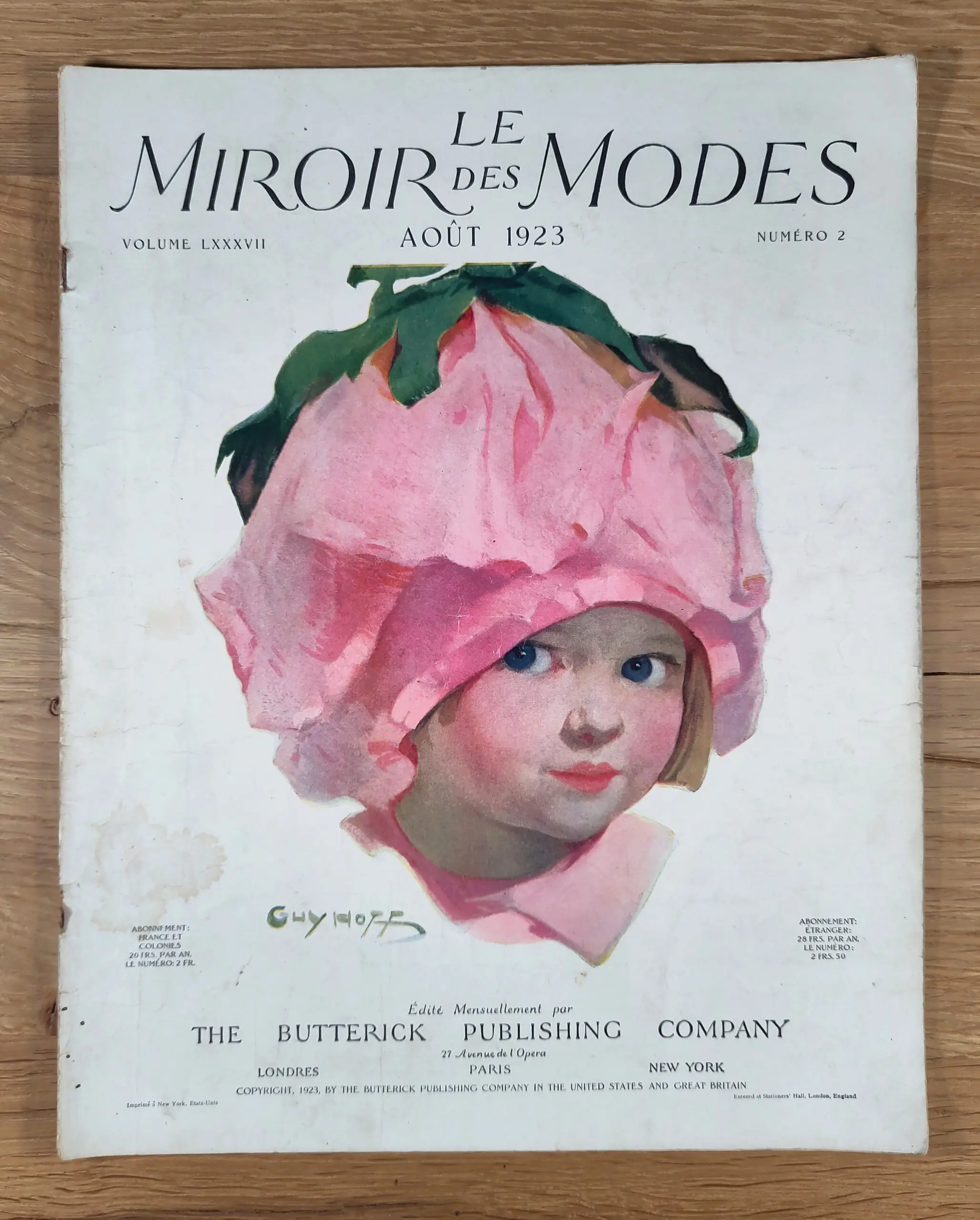 Add a touch of charm and colour to your collection with this special issue of Le Miroir des Modes, appeared in August 1923 (Numéro 2, Volume LXXXVII). The cover shows a lovely child wearing a big pink flower hat, beautifully illustrated by Guy Hoff, known for his tender, playful portraits.