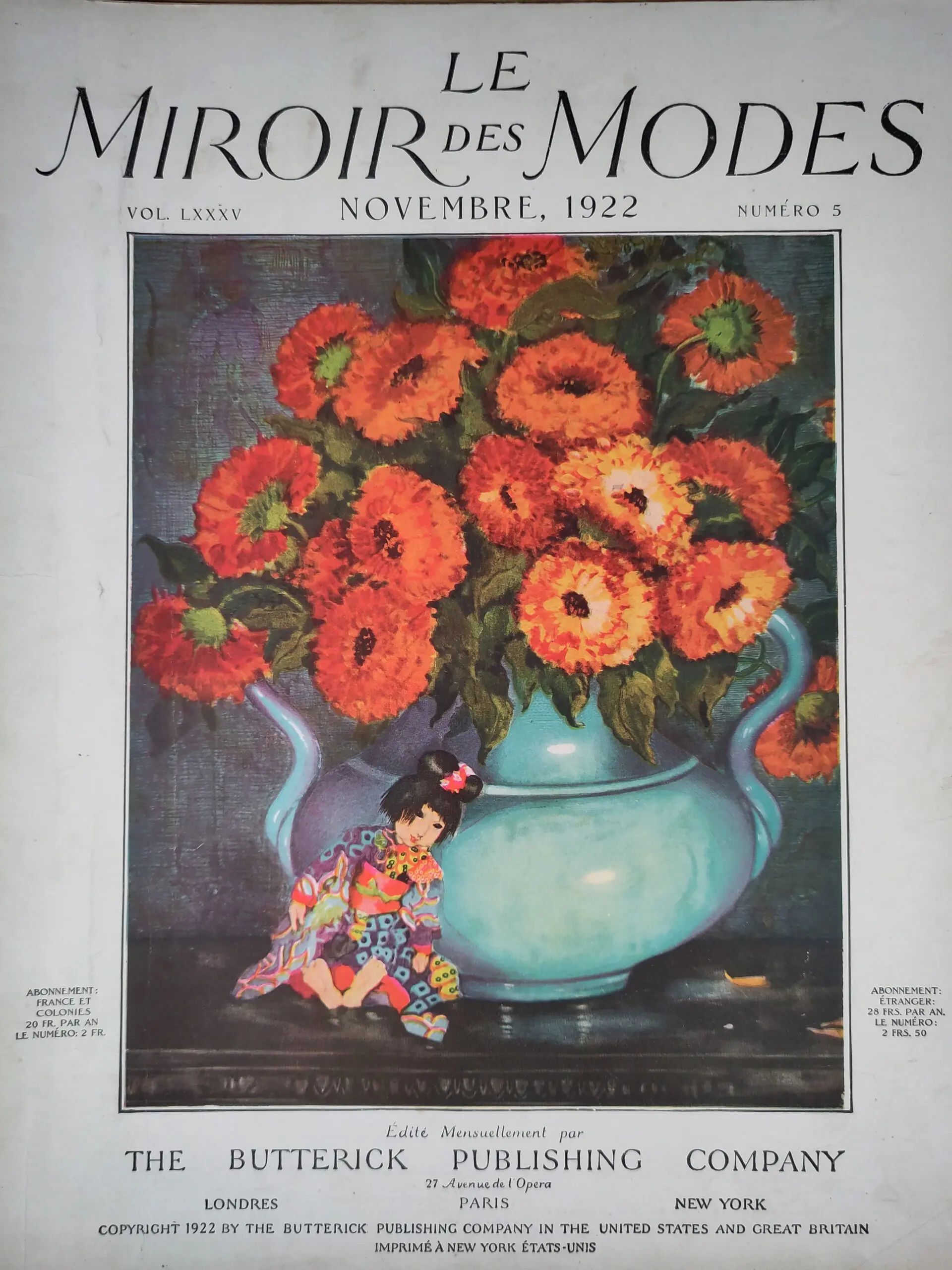 Rare original edition of the French fashion magazine Le Miroir des Modes, appeared in November 1922 - numéro 5 (Volume LXXXV). Published by The Butterick Publishing Company, known for its influence on international women's fashion in the 1920s.