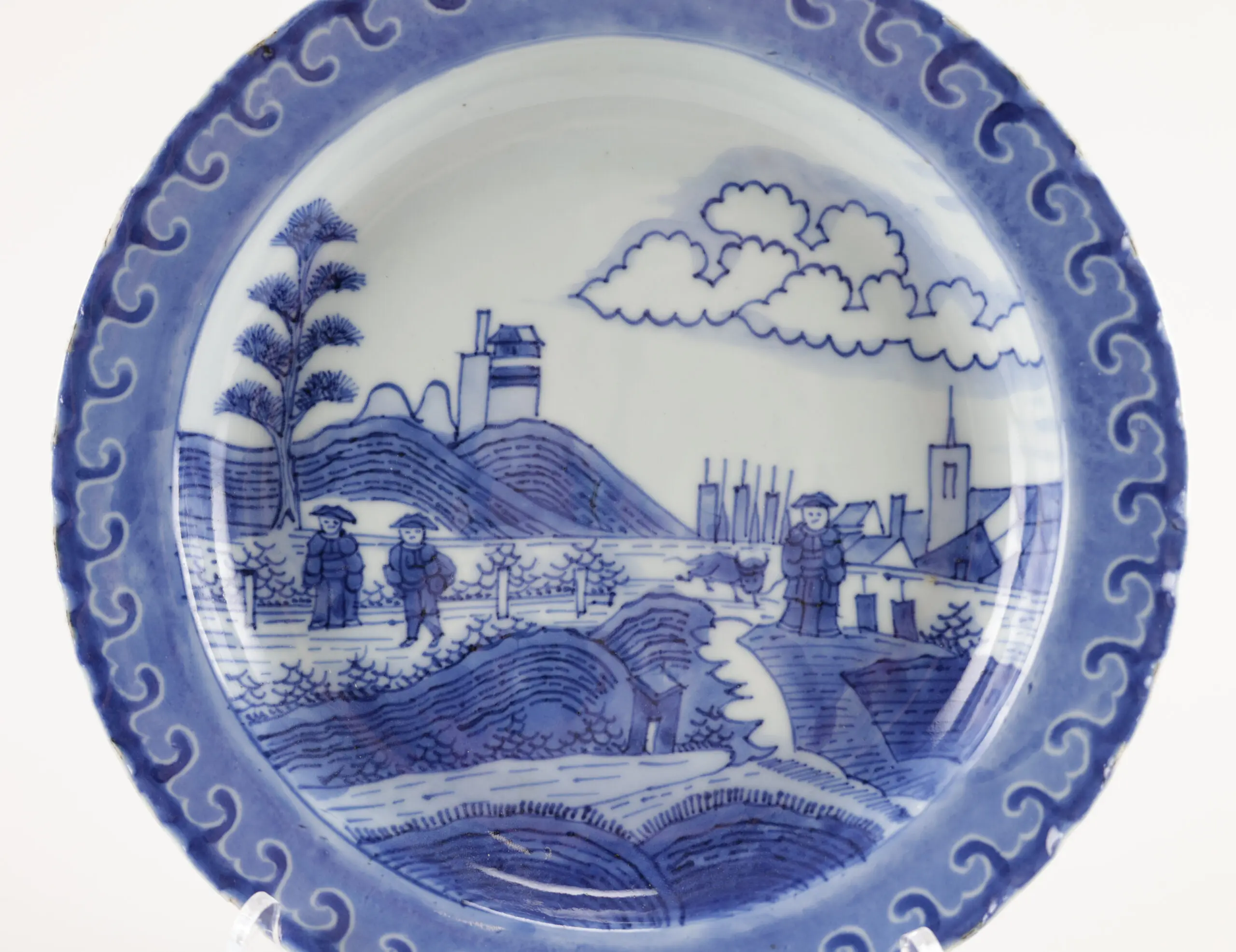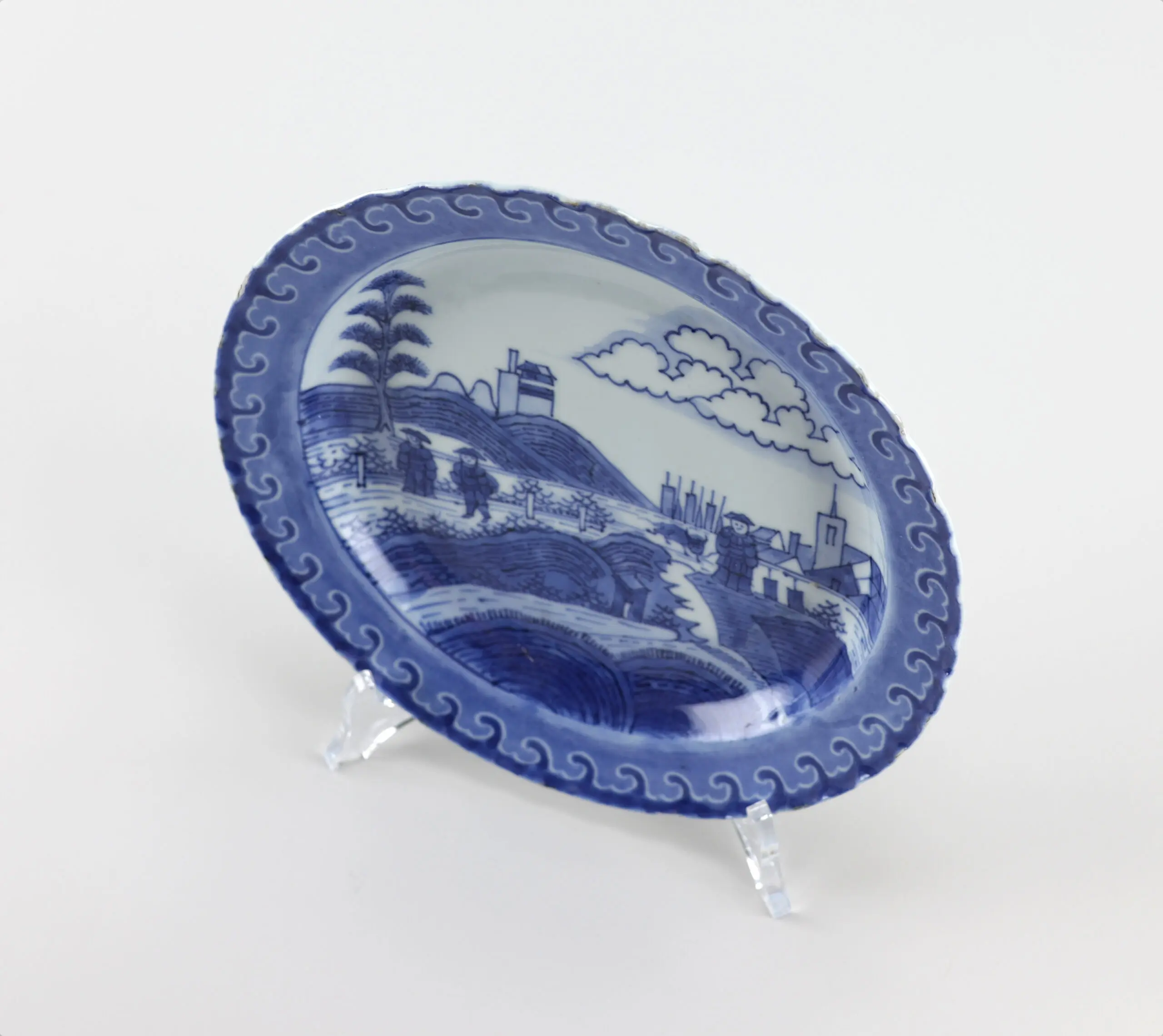 Origin & meaning: Originally produced in Japan, this design is said to be based on a design by Dutch artist Frederik van Frytom (1632-1702). It is often called the 'Scheveningen' pattern, and sometimes 'Deshima Island' or 'Nabeshima' pattern. The Chinese versions, like this plate, had a characteristic wave decoration along the rim. Unmarked.