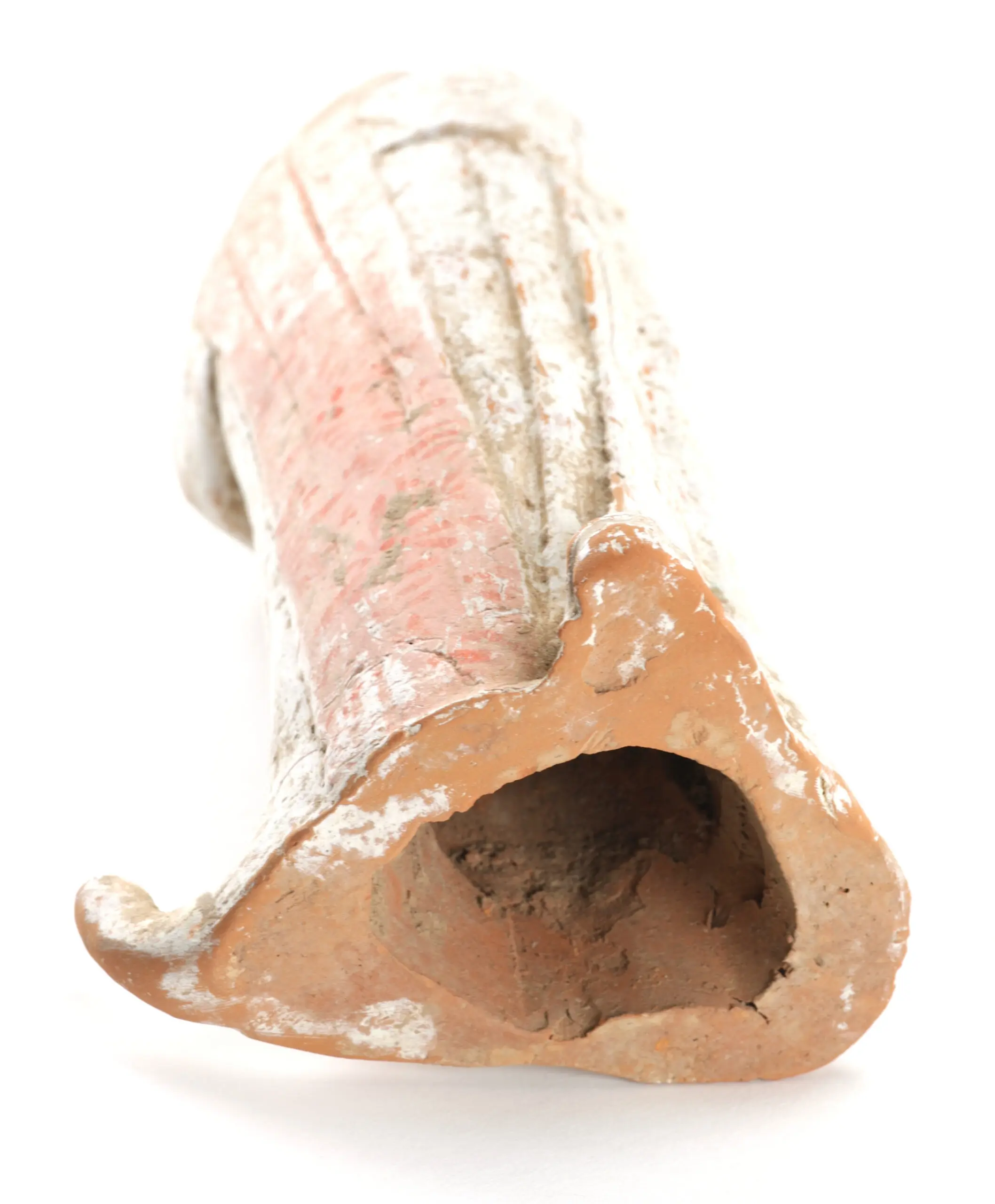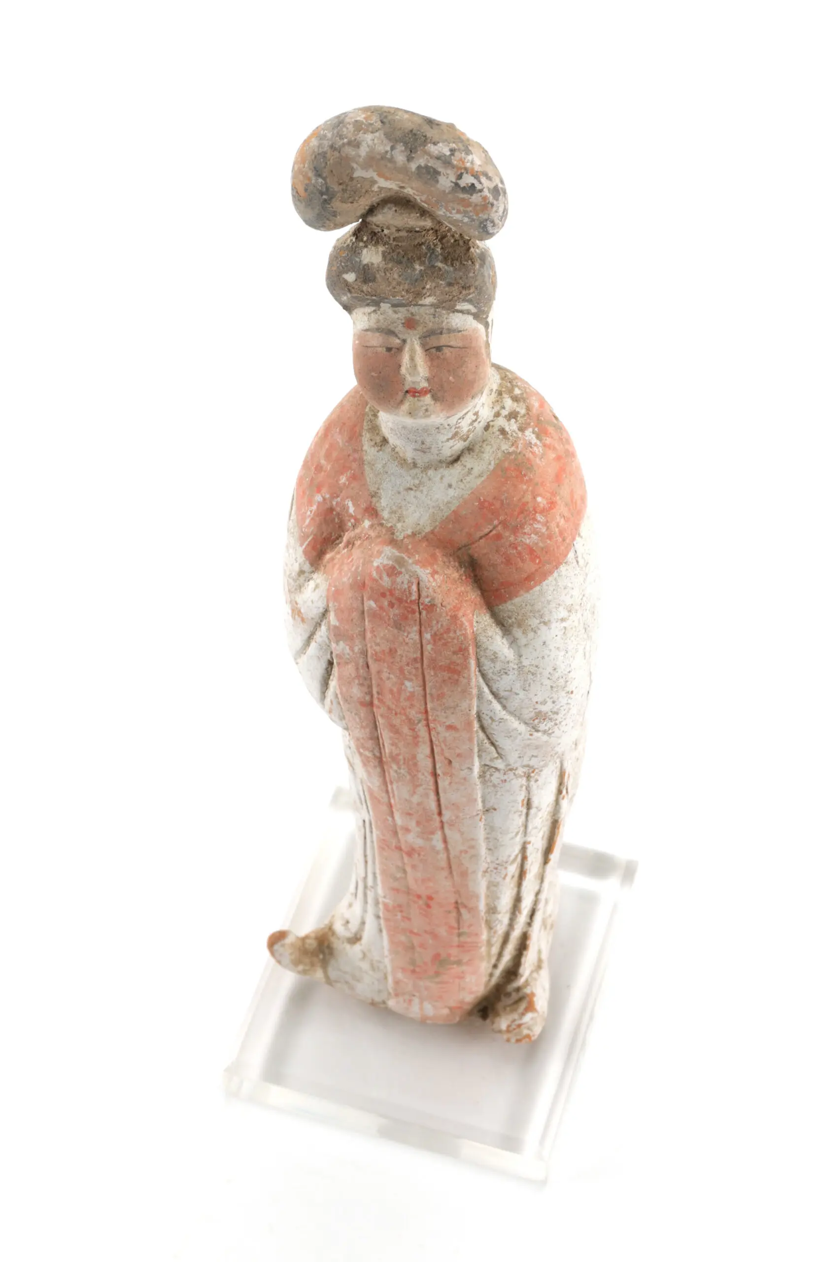 This refined tomb statue depicts a shapely court lady with the typical rounded forms that embody the Tang beauty ideal. The figure is enveloped in a pleated gown with red pigment and floral motifs, remnants of which are still clearly visible. The soft facial expression, slightly inclined head position and high coiffure give the figure a subdued, regal appearance.