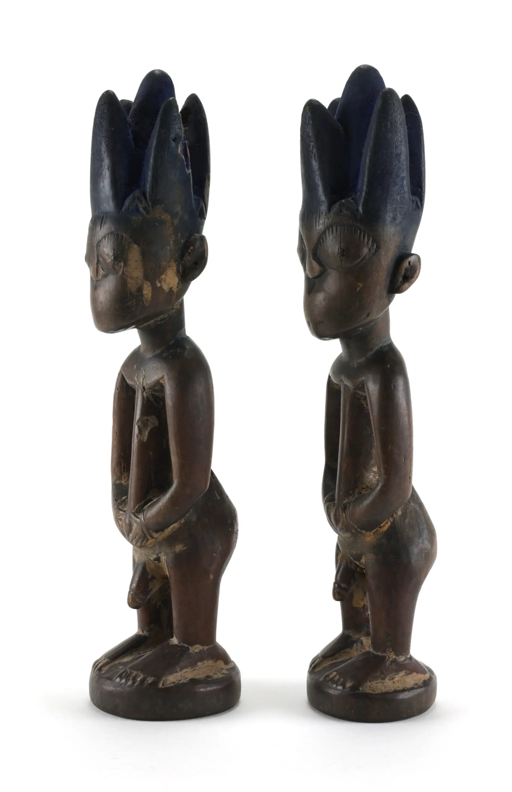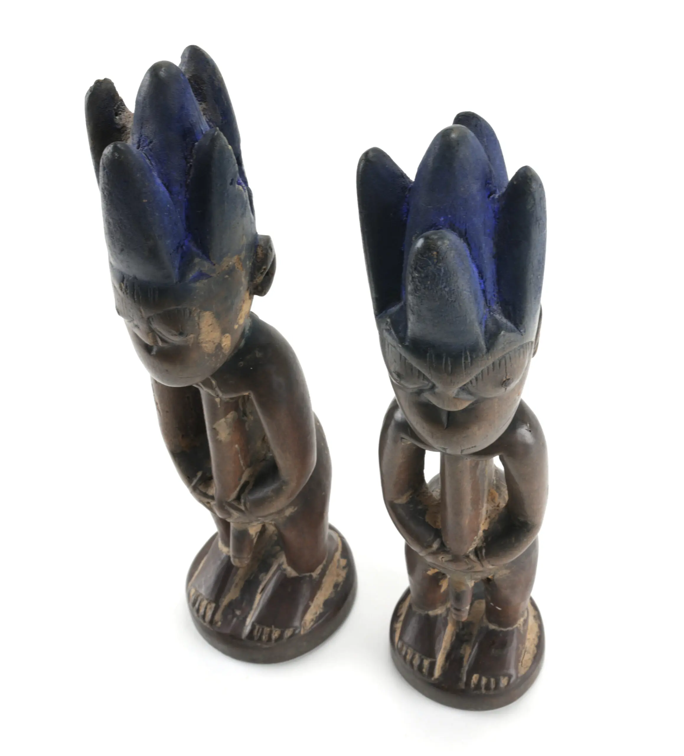 Beautiful Yoruba Ibeji male couple with blue hair from Nigeria. These impressive twin statues exude strength and spirituality, with their hefty stature, dark patina and vivid blue pigment residue on the high hairstyles.