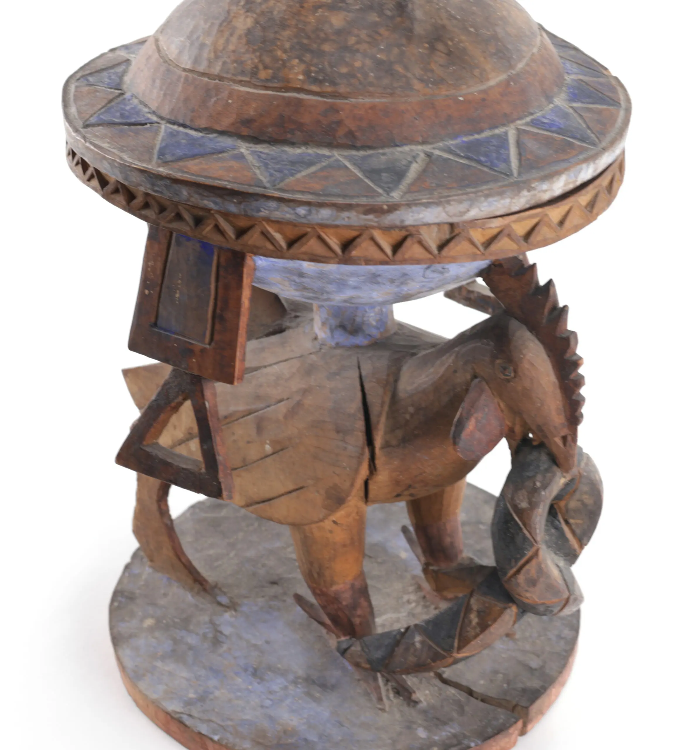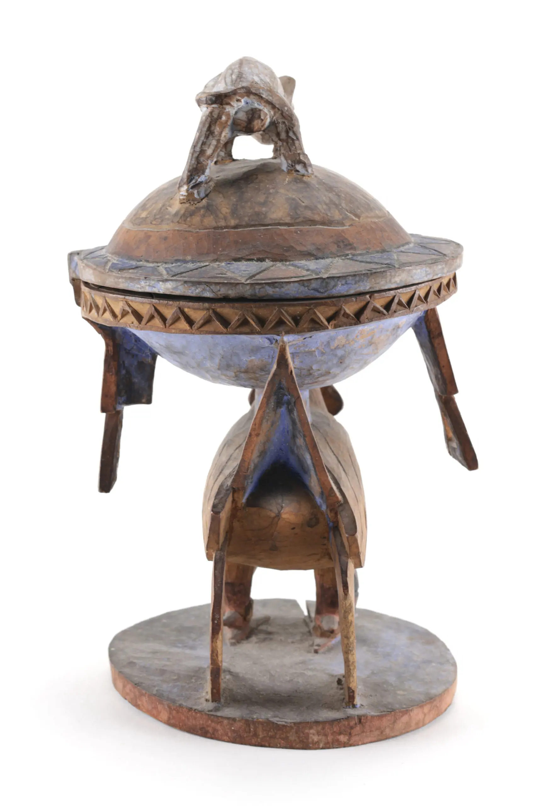 Extraordinary Yoruba offering bowl from Nigeria with rooster, snake and cat - enriched by traces of indigo and ochre pigment. A ritual showpiece that is not only iconographically rich but also visibly bears the time and intention of use in its original colour accents.