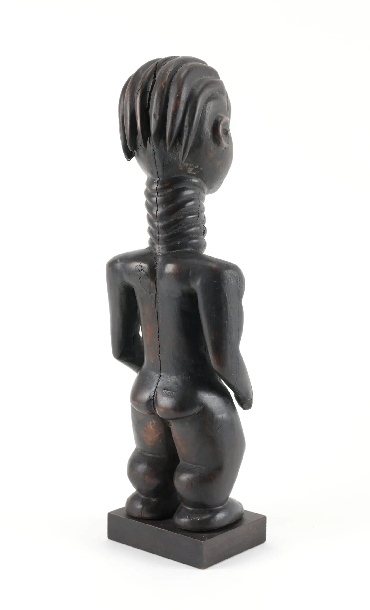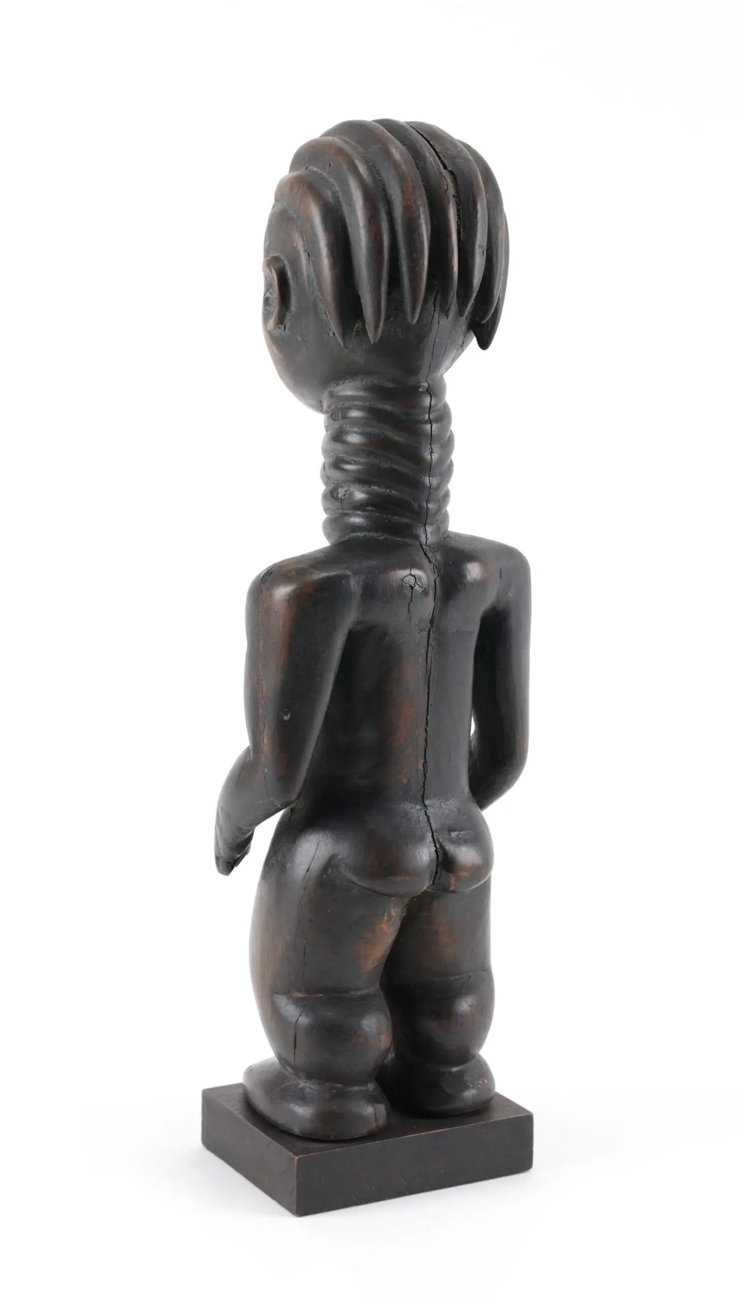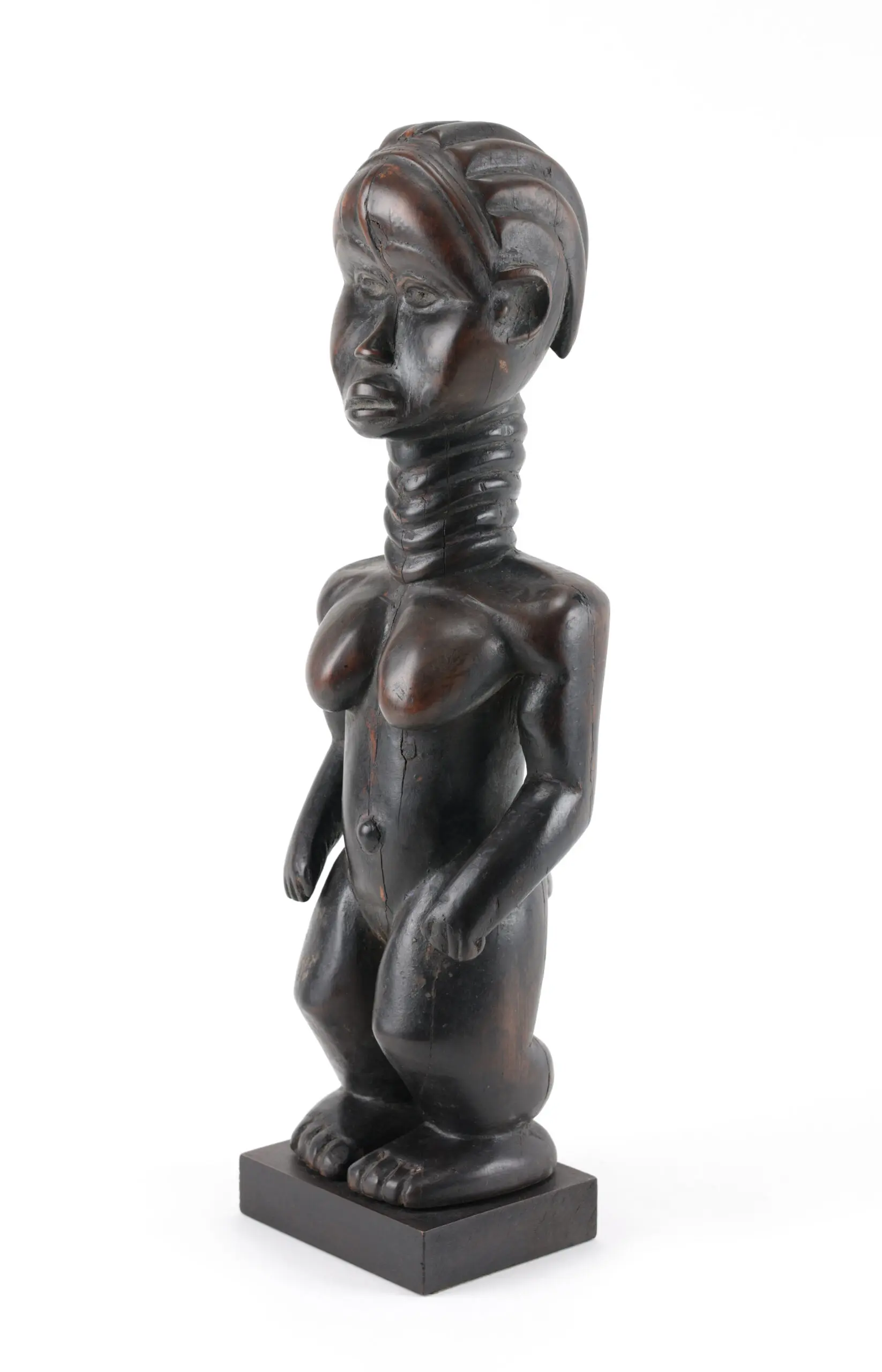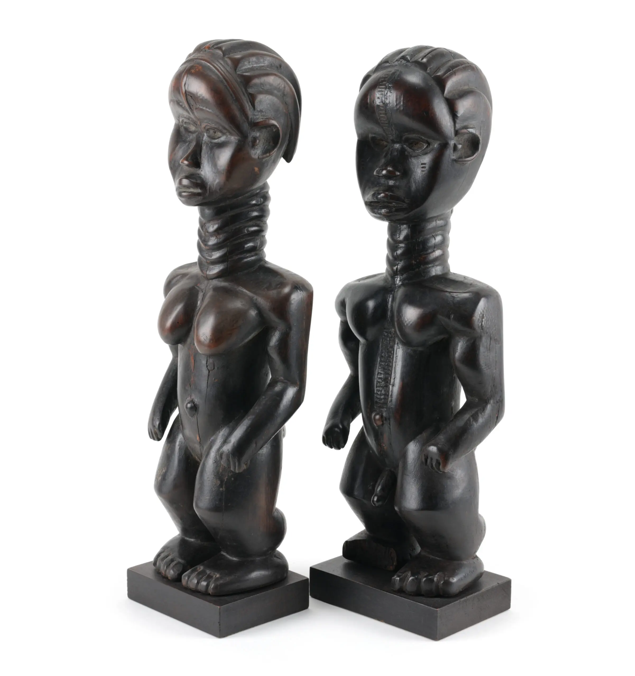 Deze twee houten figuren vormen een overtuigend en hecht ensemble, gesneden uit dezelfde houtsoort en duidelijk door één hand vervaardigd. De compacte lichamen, zware benen en lange, ringvormige halzen geven de beelden een ingetogen maar zeer fysieke aanwezigheid. De sobere gezichten en strakke houding zorgen voor spanning zonder theatrale overdrijving.