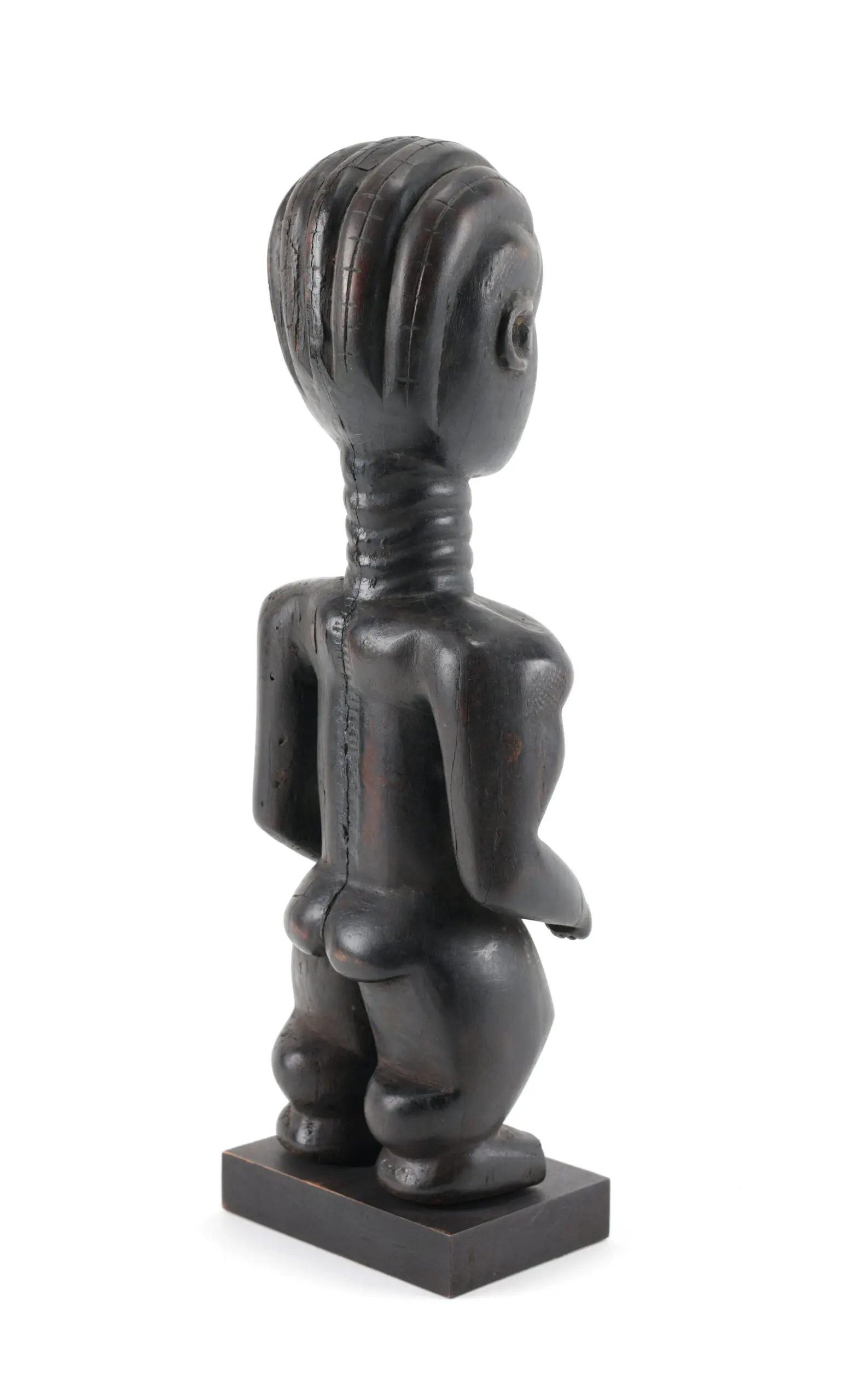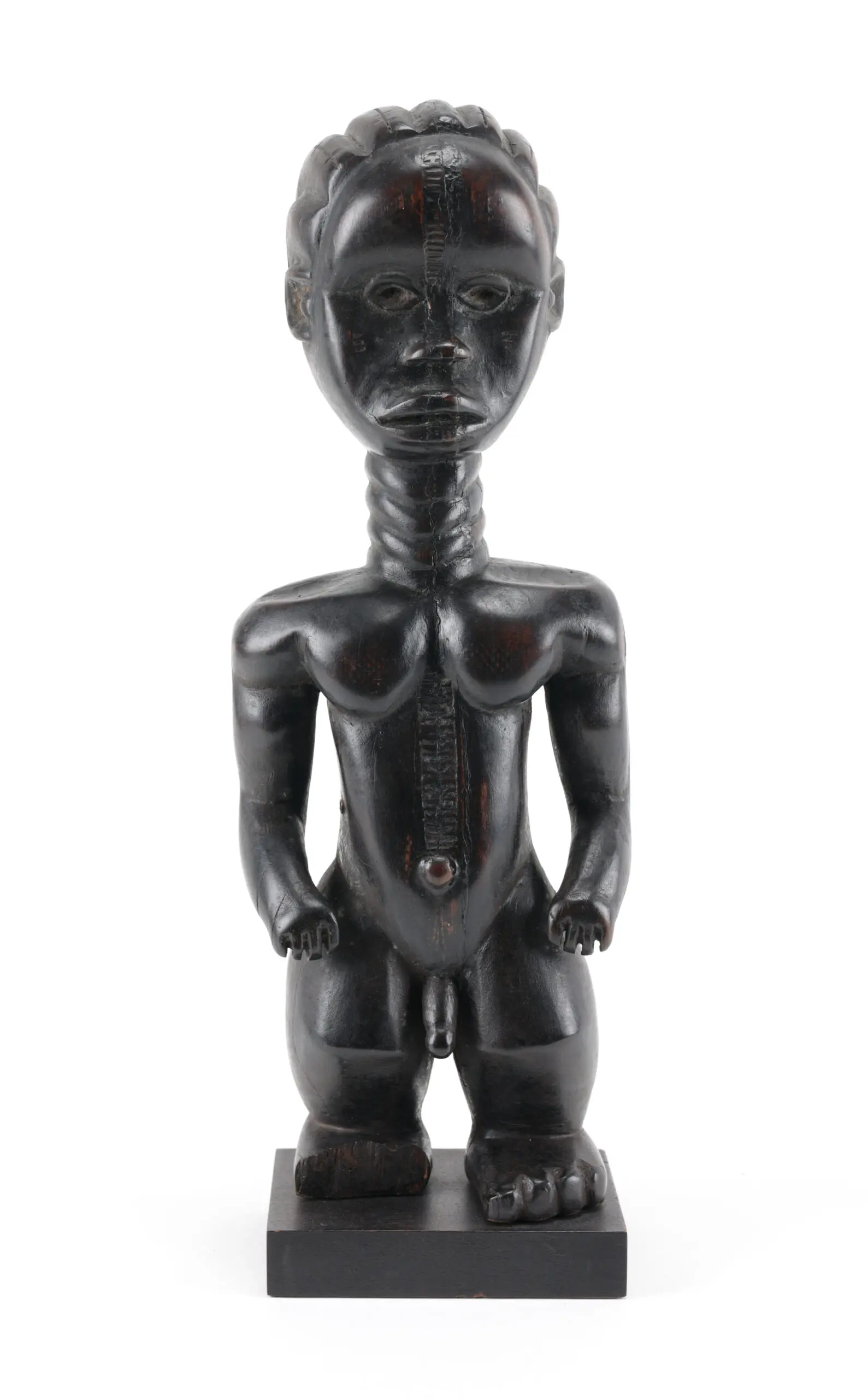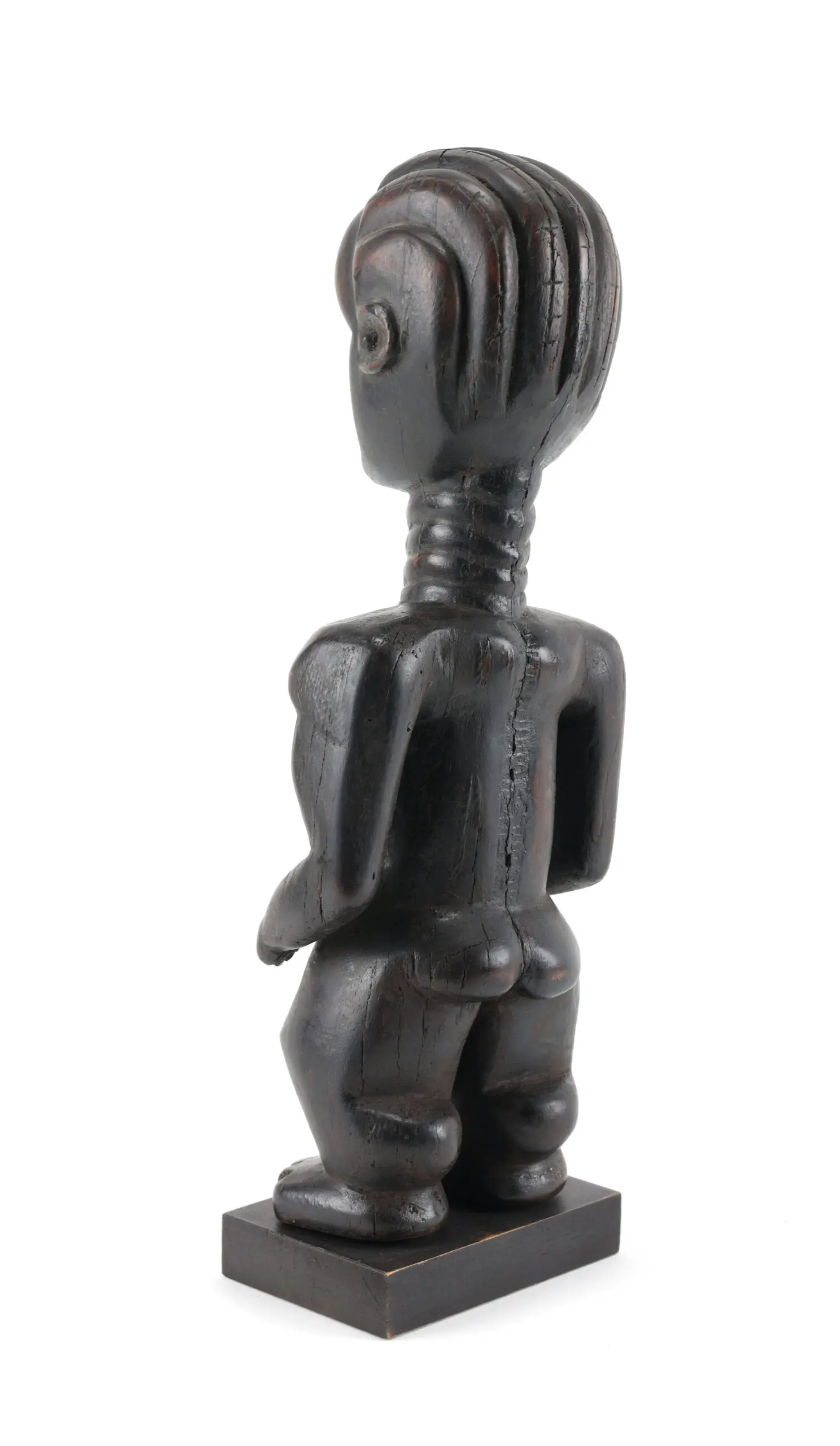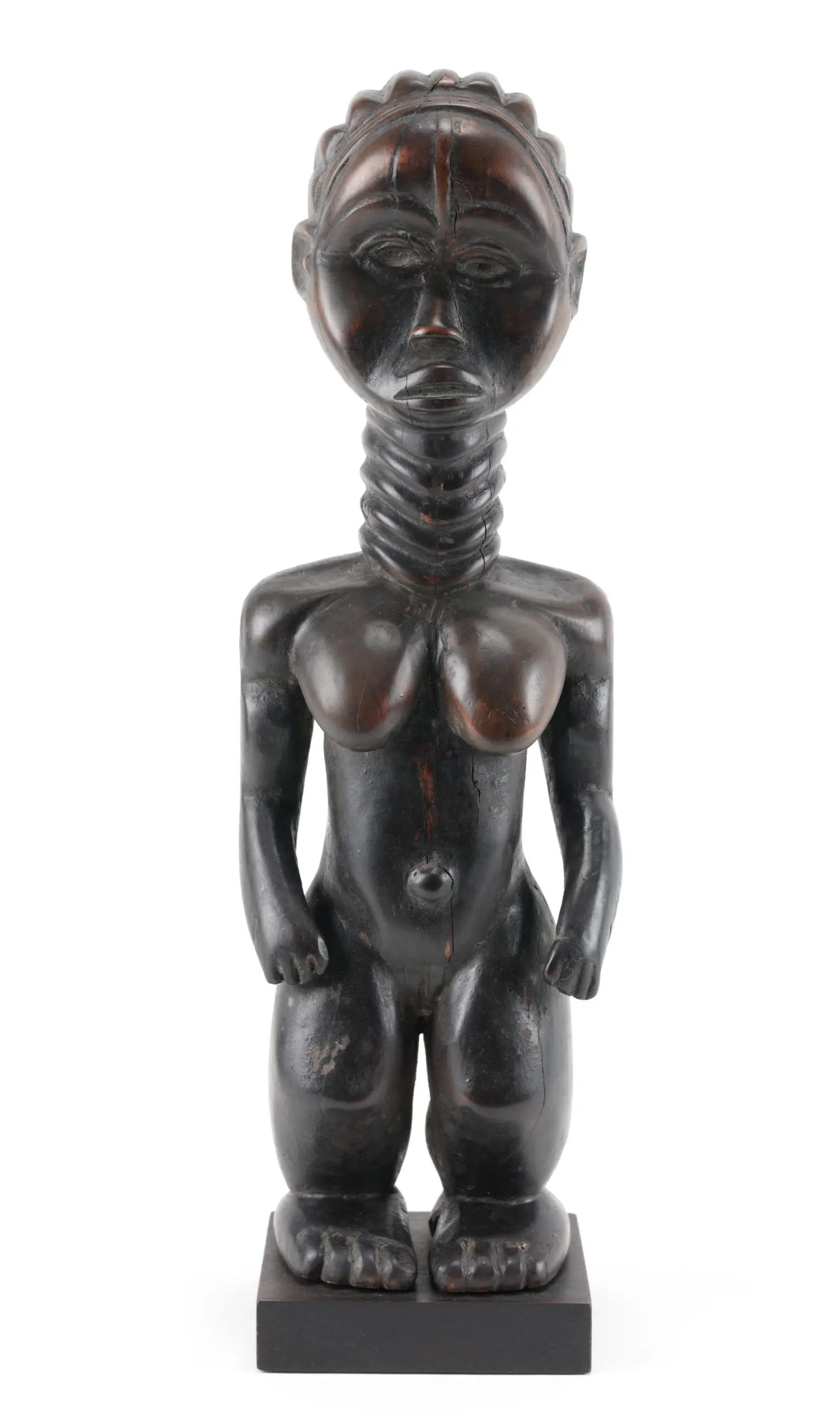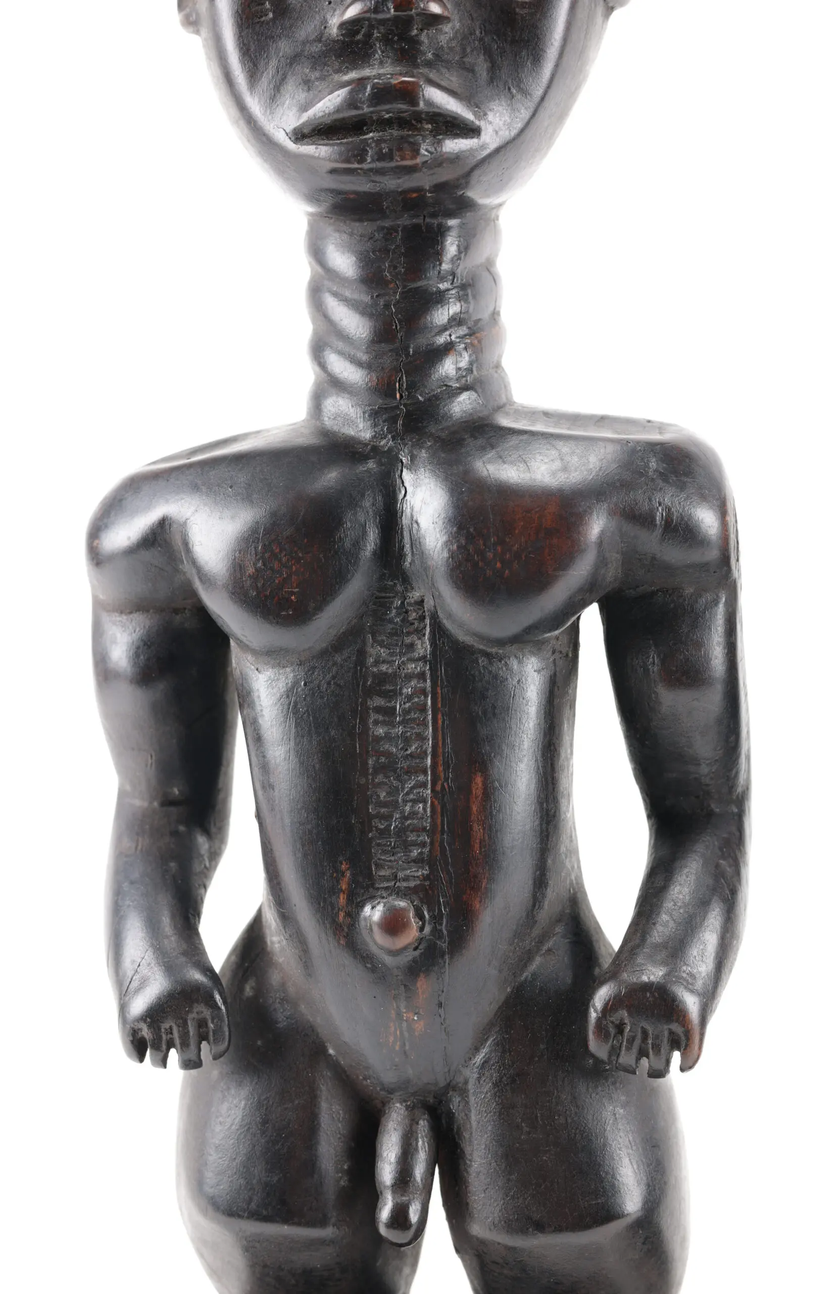 Deze twee houten figuren vormen een overtuigend en hecht ensemble, gesneden uit dezelfde houtsoort en duidelijk door één hand vervaardigd. De compacte lichamen, zware benen en lange, ringvormige halzen geven de beelden een ingetogen maar zeer fysieke aanwezigheid. De sobere gezichten en strakke houding zorgen voor spanning zonder theatrale overdrijving.