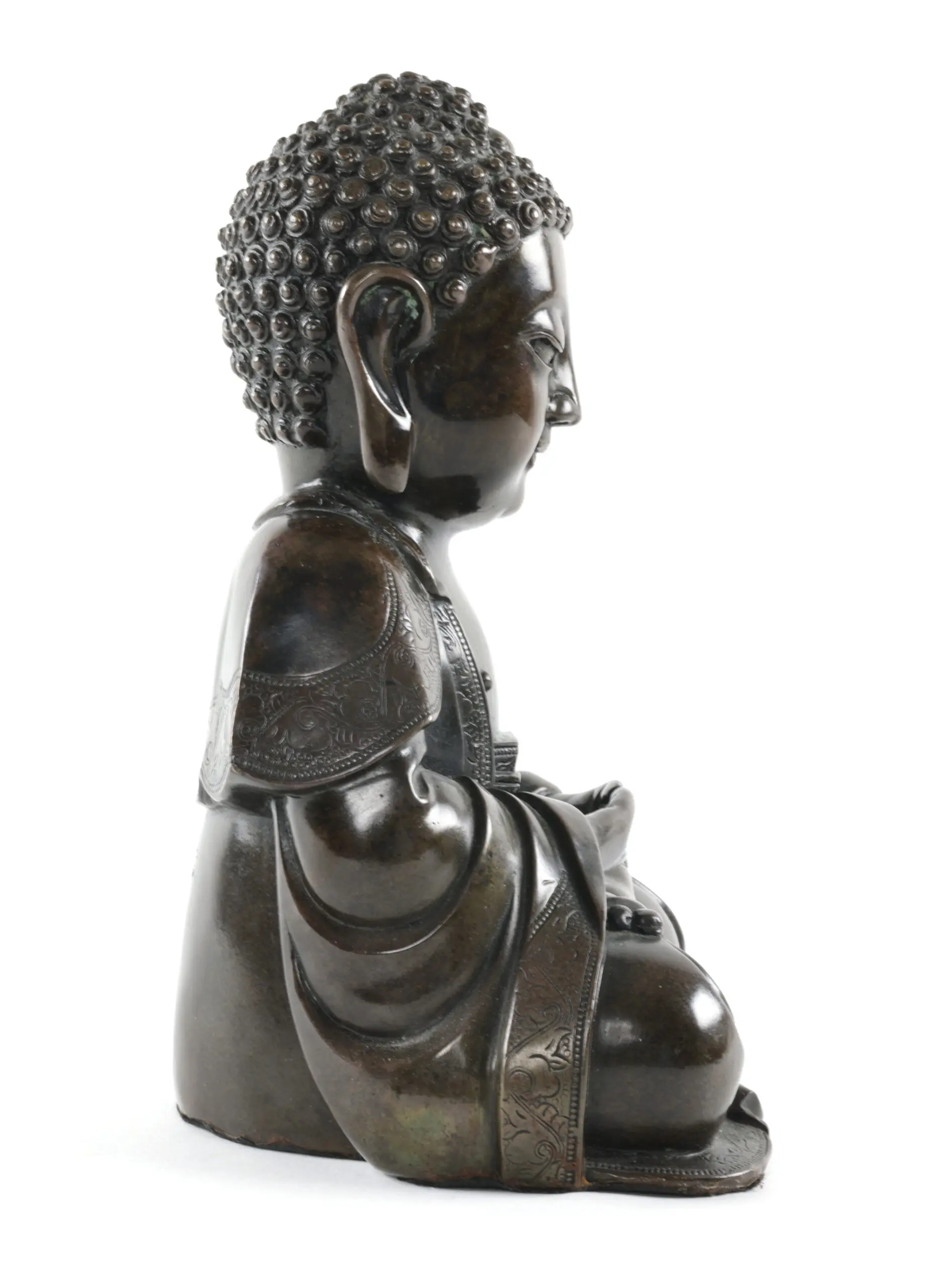 Afkomstig van Veilinghuis De Zwaan in Amsterdam (2023). De Amida Boeddha, ook wel de Boeddha van het Oneindige Licht, is een belangrijk symbool in het Japanse Pure Land boeddhisme en staat voor compassie en verlichting. Dit bronzen beeld draagt een apocriefe Yongle markering (大明永樂年製) aan de achterzijde, een eerbetoon aan de beroemde Ming keizer, vaak toegepast door Japanse bronsgieters in de 19e eeuw.