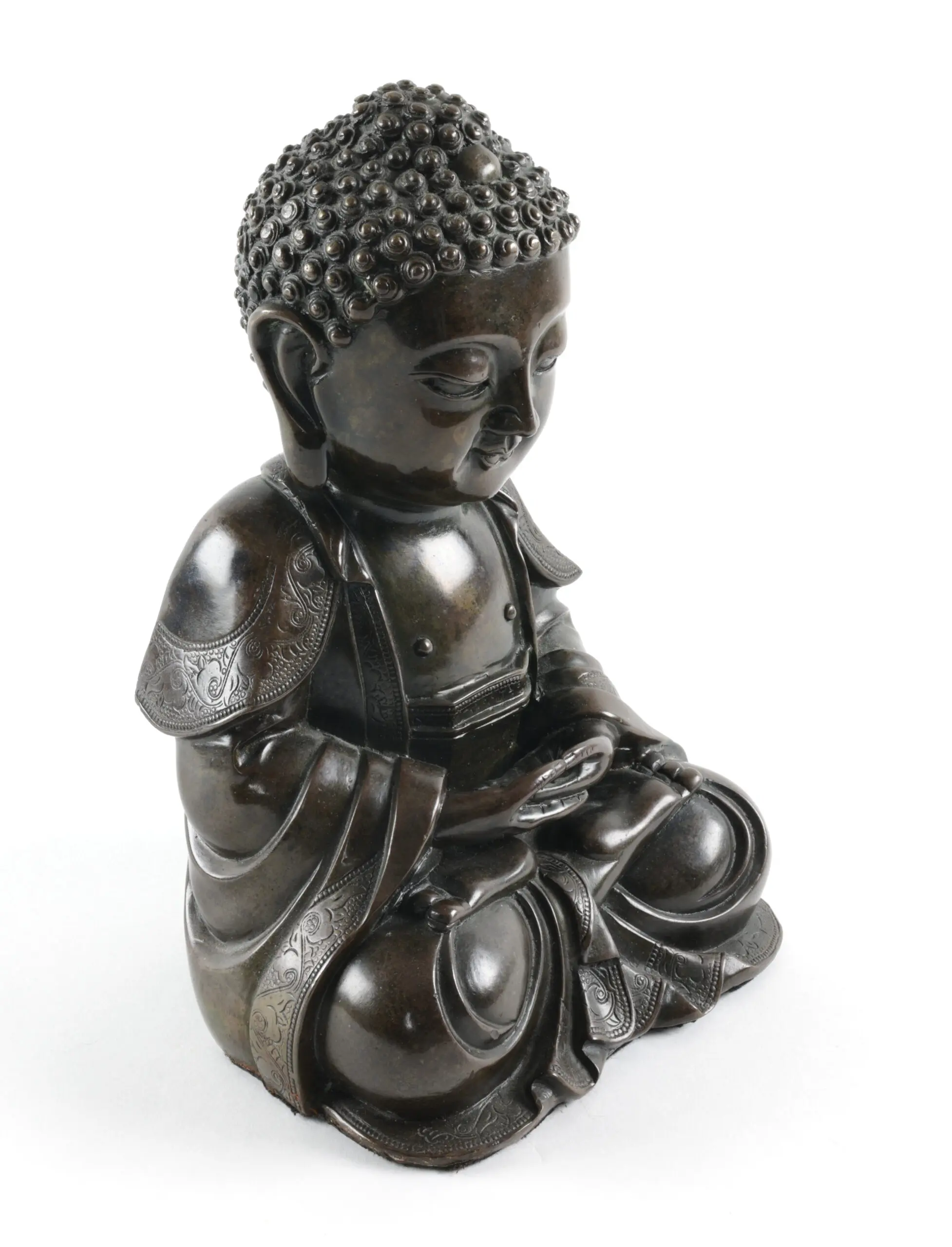 Hoogte 24 cm, breedte 16 cm. Uitgevoerd in donker patina met fijn bewerkte gewaden en zorgvuldig gemodelleerde krullen in het haar. Het beeld verkeert in uitstekende staat, met enkel lichte ouderdomssporen passend bij de leeftijd. Bekijk de foto’s voor de details.