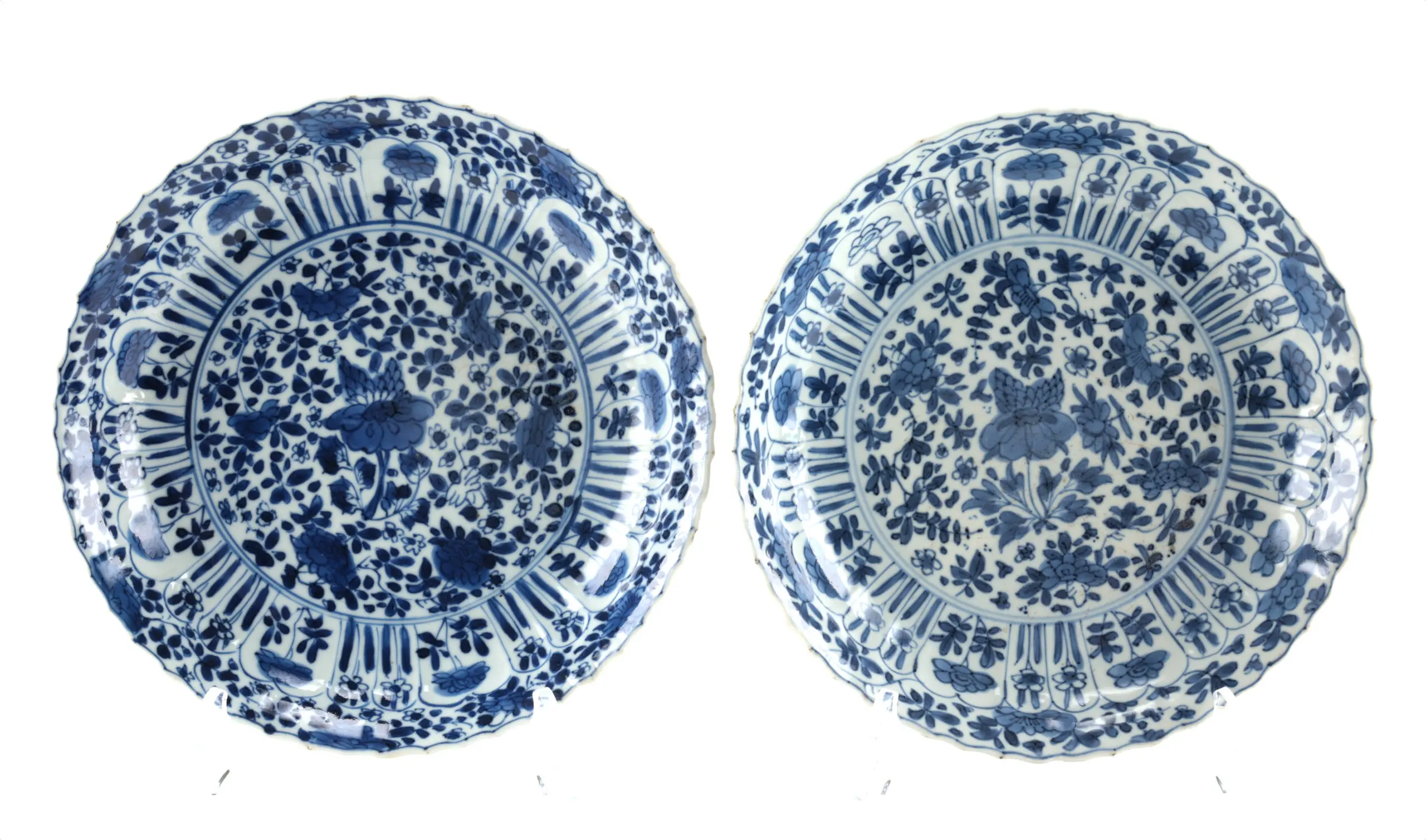 Prachtige set van 2 Kangxi borden uit China, eind 17e eeuw, met verfijnd blauw-wit floraal decor en authentieke gebruikssporen.