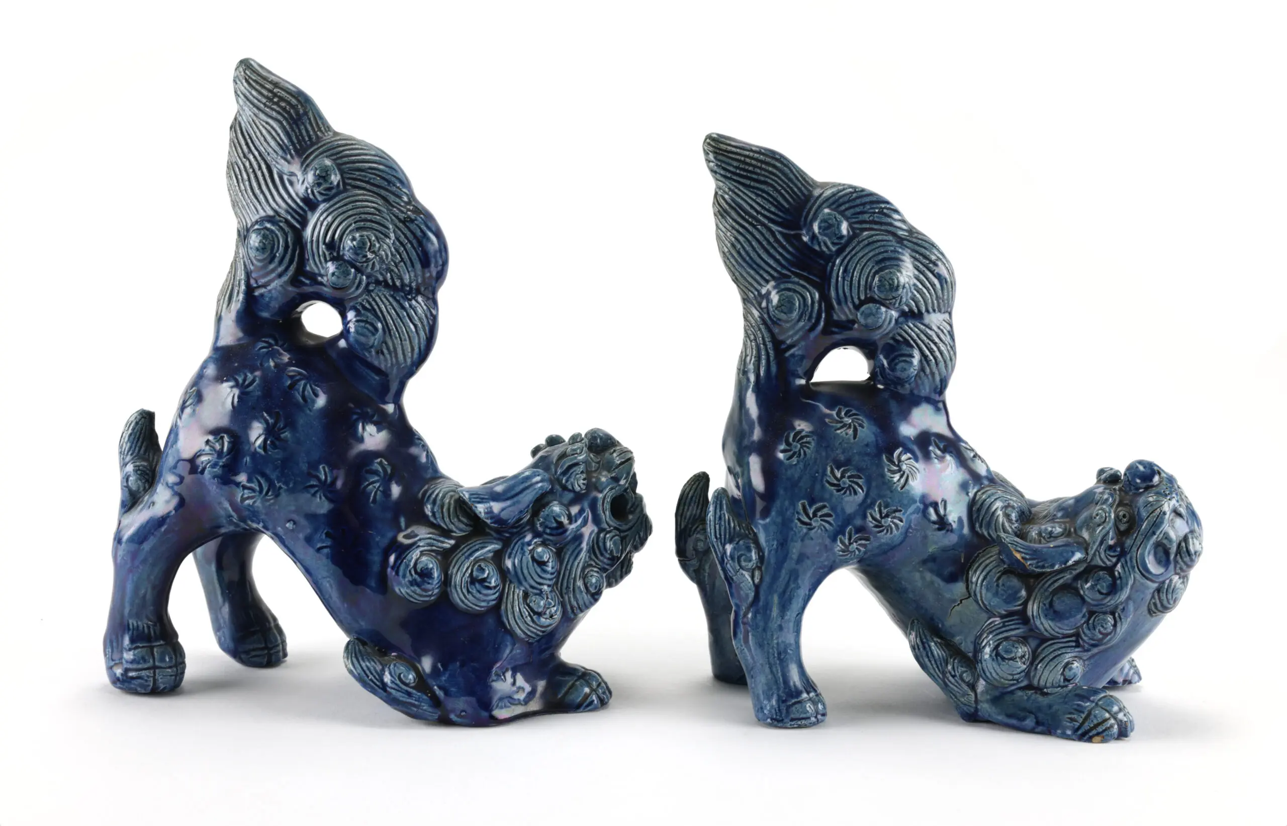 Zeldzame set van 2 Japanse Foo Dogs uit de 19de eeuw, uitgevoerd in diepblauw geglazuurd keramiek met krachtige uitstraling en verfijnde details.