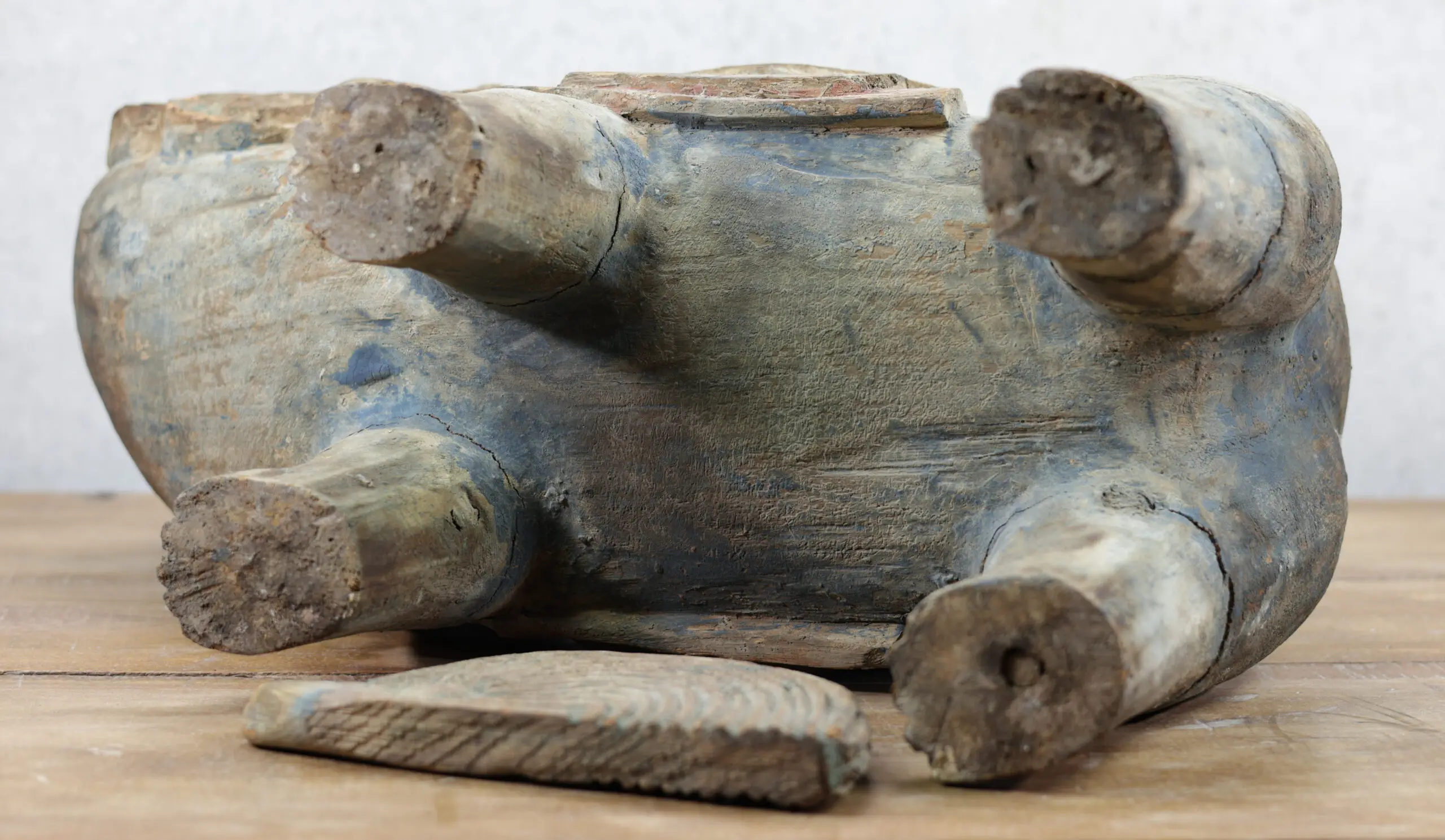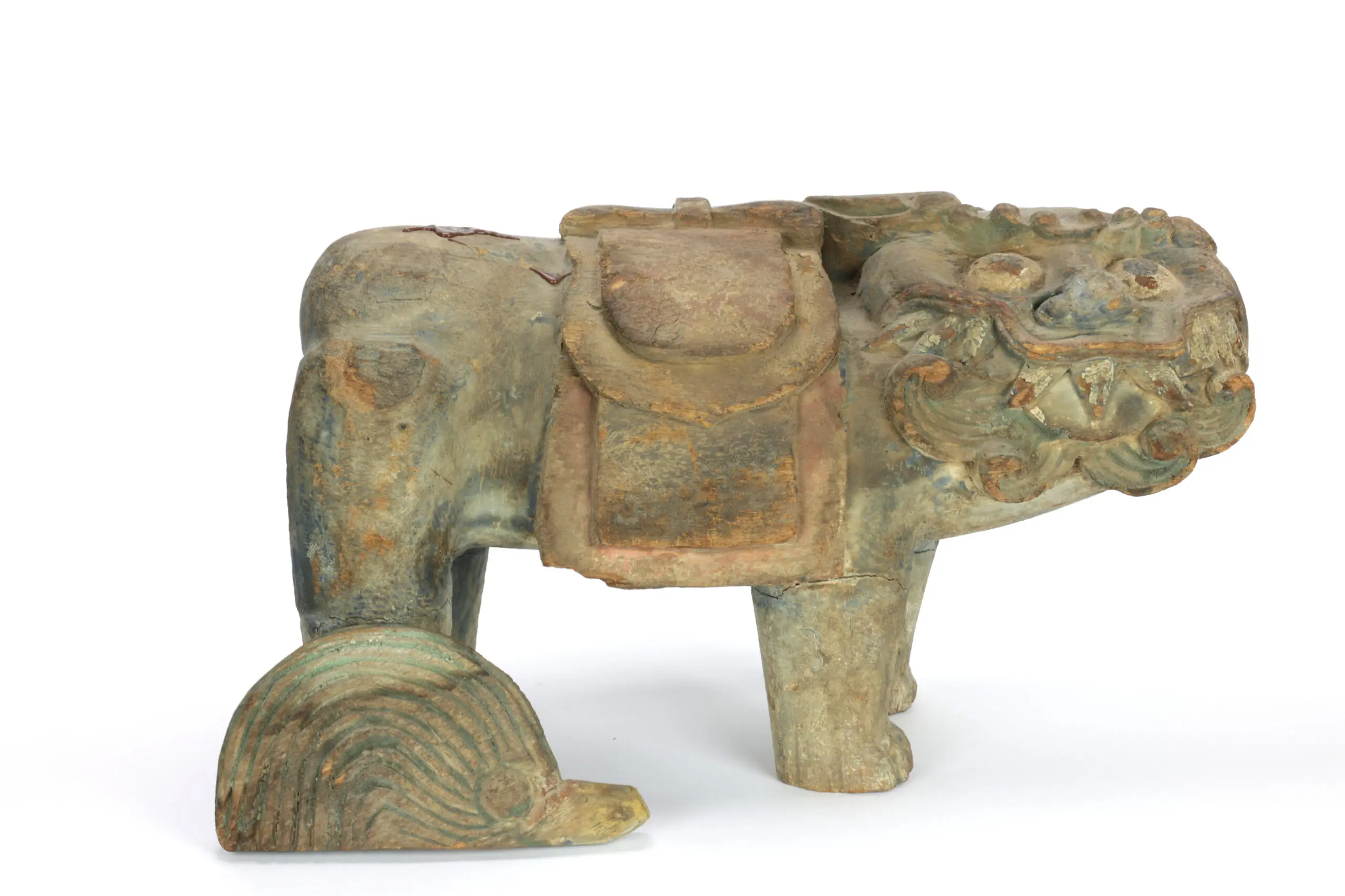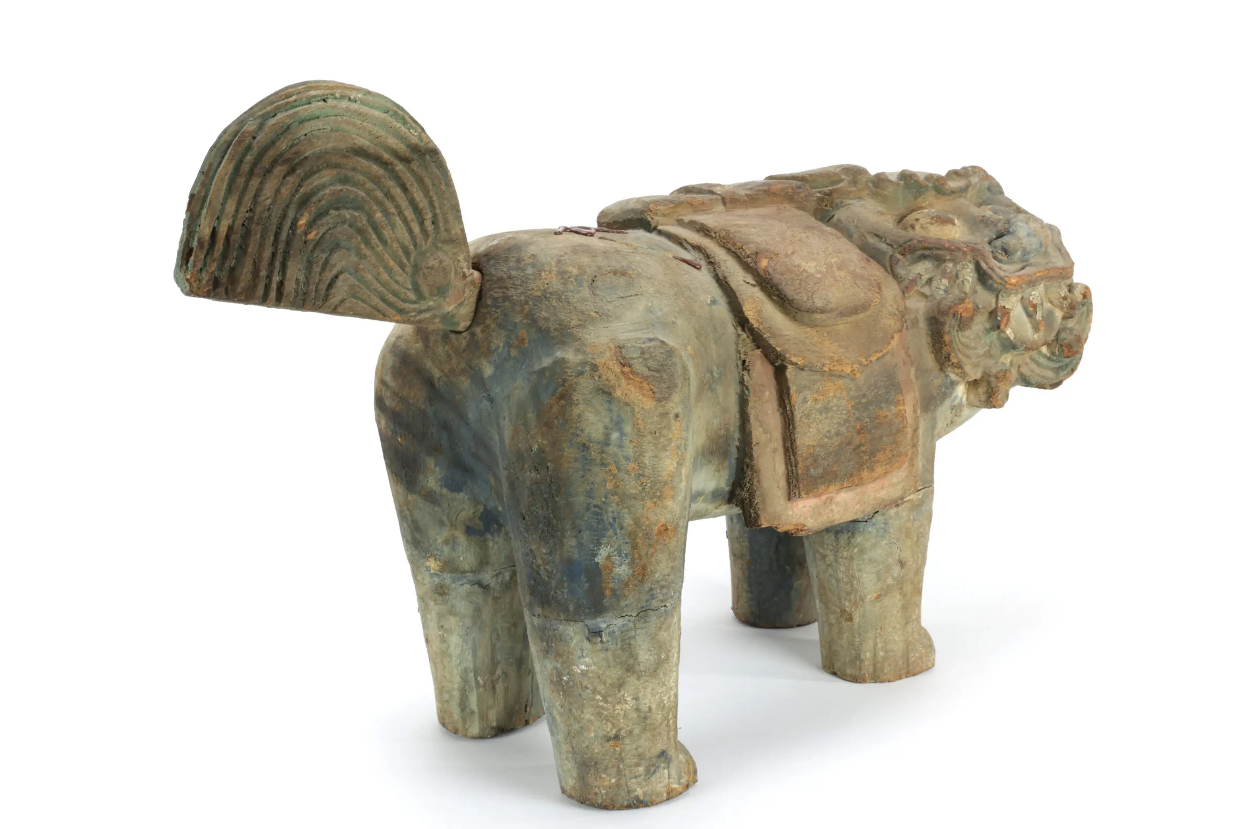 Deze wachters van geluk en bescherming zijn uit hout gesneden en tonen nog duidelijke sporen van rode, blauwe en goudkleurige verf — resten van hun oorspronkelijke tempelpolychromie. De brede koppen met krullende manen, expressieve snorpartijen en de zadelvormige panelen langs de flanken geven de beelden een monumentale présence. Hun staarten zijn origineel los inzetbaar – een kenmerkend constructiedetail bij dit type tempelbeeldhouwwerk. Mooie, doorleefde patina met natuurlijke droogtescheurtjes passend bij de 18e–19e eeuw.