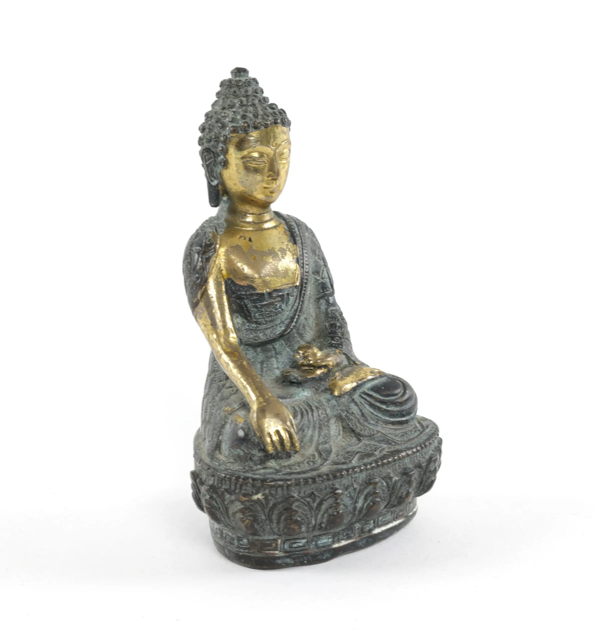 Dit beeldje toont Shakyamuni, de historische Boeddha, met zijn rechterhand de aarde aanrakend in de bhumisparsamudra. Deze houding symboliseert het moment van verlichting onder de bodhiboom, waarbij de aarde als getuige werd aangeroepen. De deels vergulde afwerking benadrukt de heilige uitstraling. De onderzijde draagt een bloemrozetmerk, typisch voor werkplaatsen rond 1900 in de late Qing-periode.
