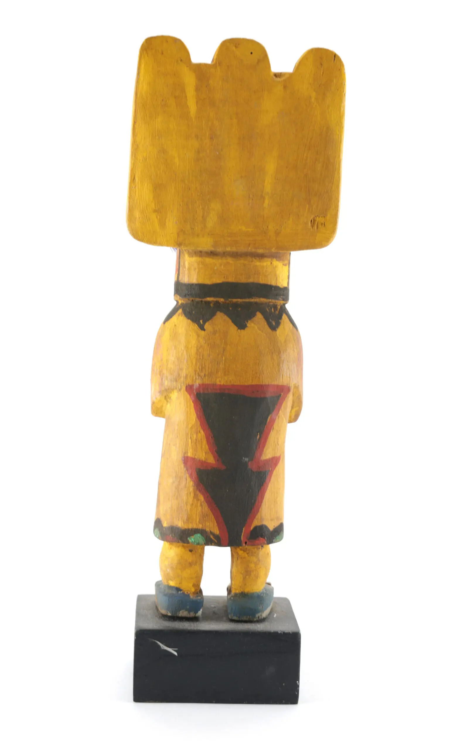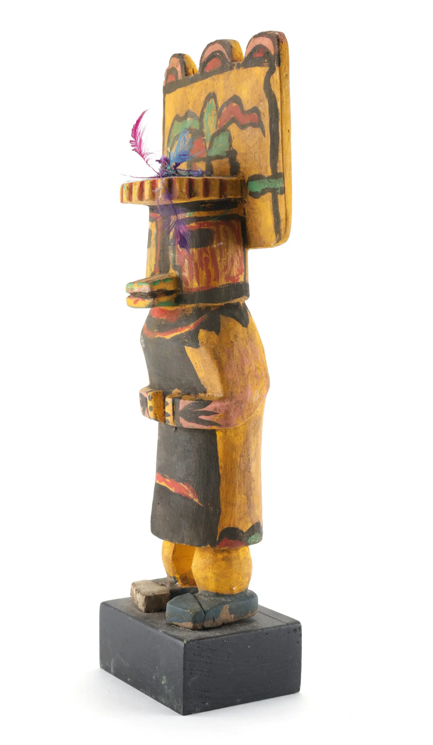 Deze kachina (hoogte 33 cm, breedte 8,5 cm, diepte 7 cm) is een fraai voorbeeld van Hopi-beeldhouwkunst. Hij draagt een hoge, rechthoekige hoofdtooi met kleurrijke motieven en veren, typisch voor de Shalako-figuren die als boodschappers optreden tijdens de winterceremonies. De geel-zwarte beschildering, accenten in rood en groen en de gedetailleerde gelaatsschildering versterken zijn rituele karakter.