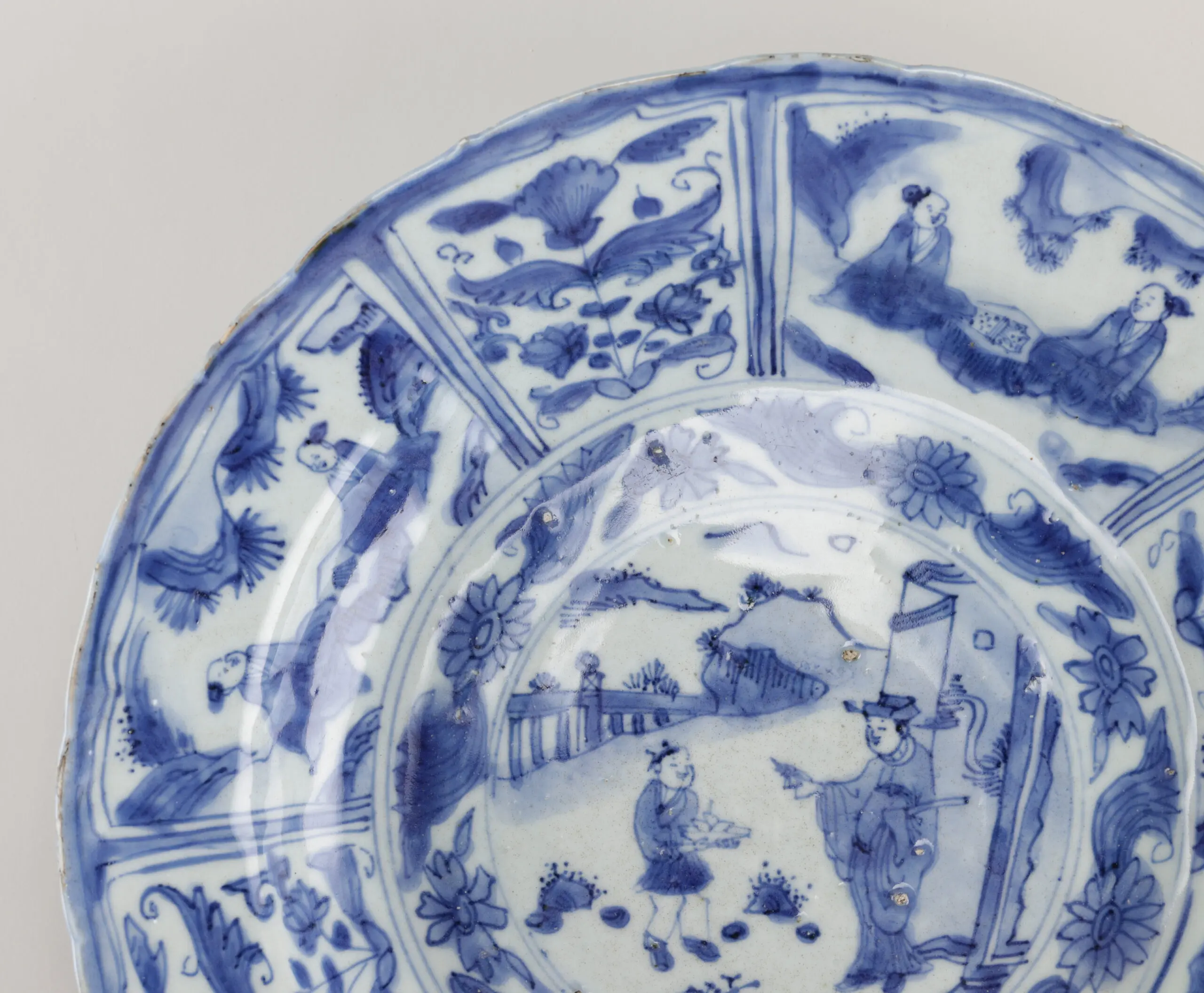 Een prachtige kraakporseleinen schotel uit de Chinese Transitional-periode (17e eeuw), met een indrukwekkende diameter van 31,5 cm. Deze diepe schaal toont een levendige blauwe decoratie met figuren, vogels, bloemen en landschappen, typerend voor deze zeldzame overgangsperiode tussen Ming en Qing. Ondanks enkele fritjes aan de rand verkeert het stuk in goede staat voor zijn leeftijd. Dit is een waardevol verzamelobject voor liefhebbers van vroeg Chinees blauw-wit porselein, met karakter én geschiedenis.