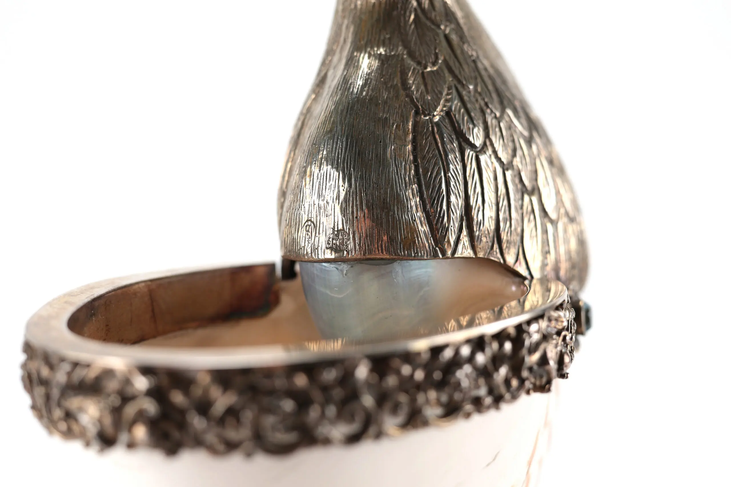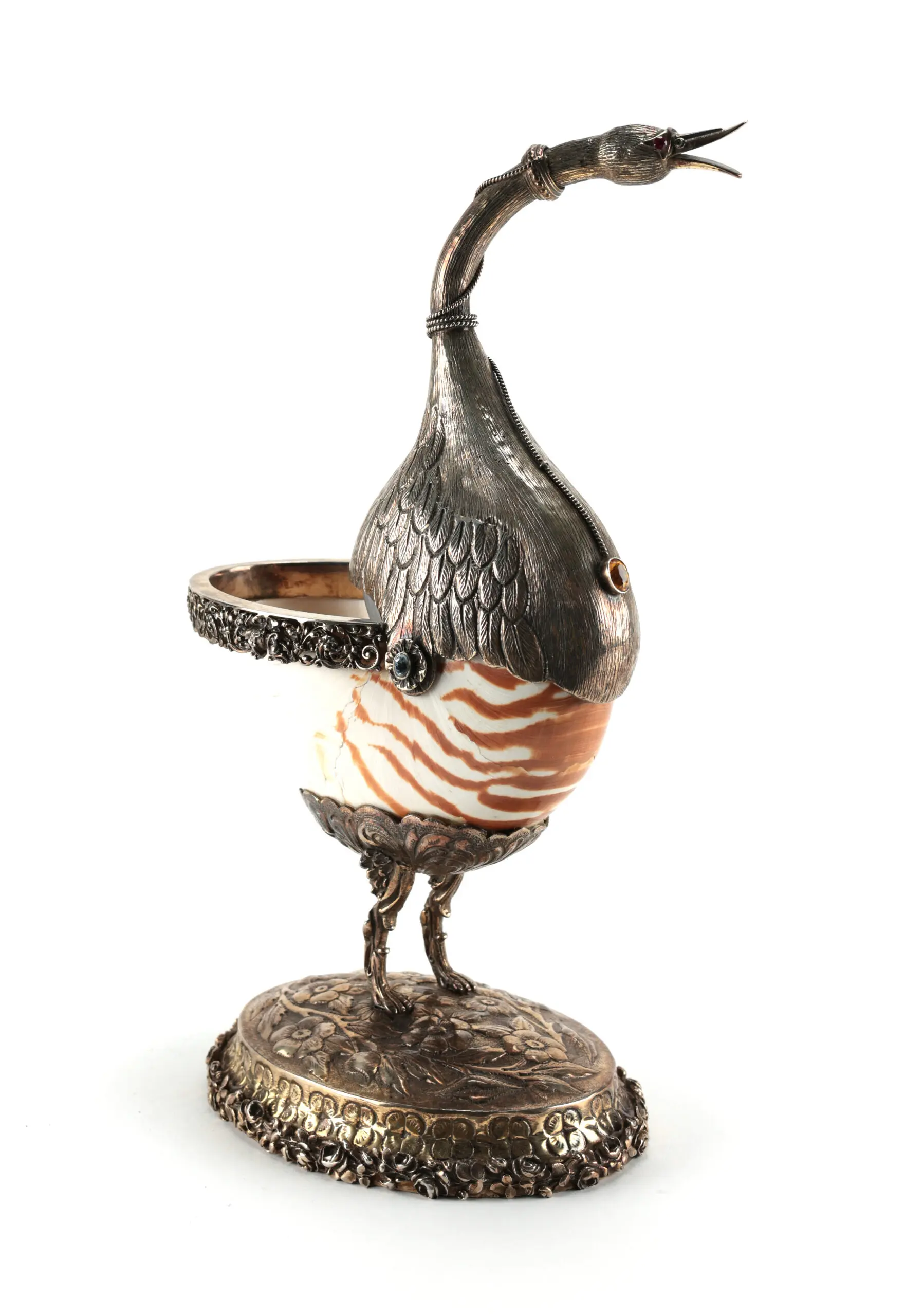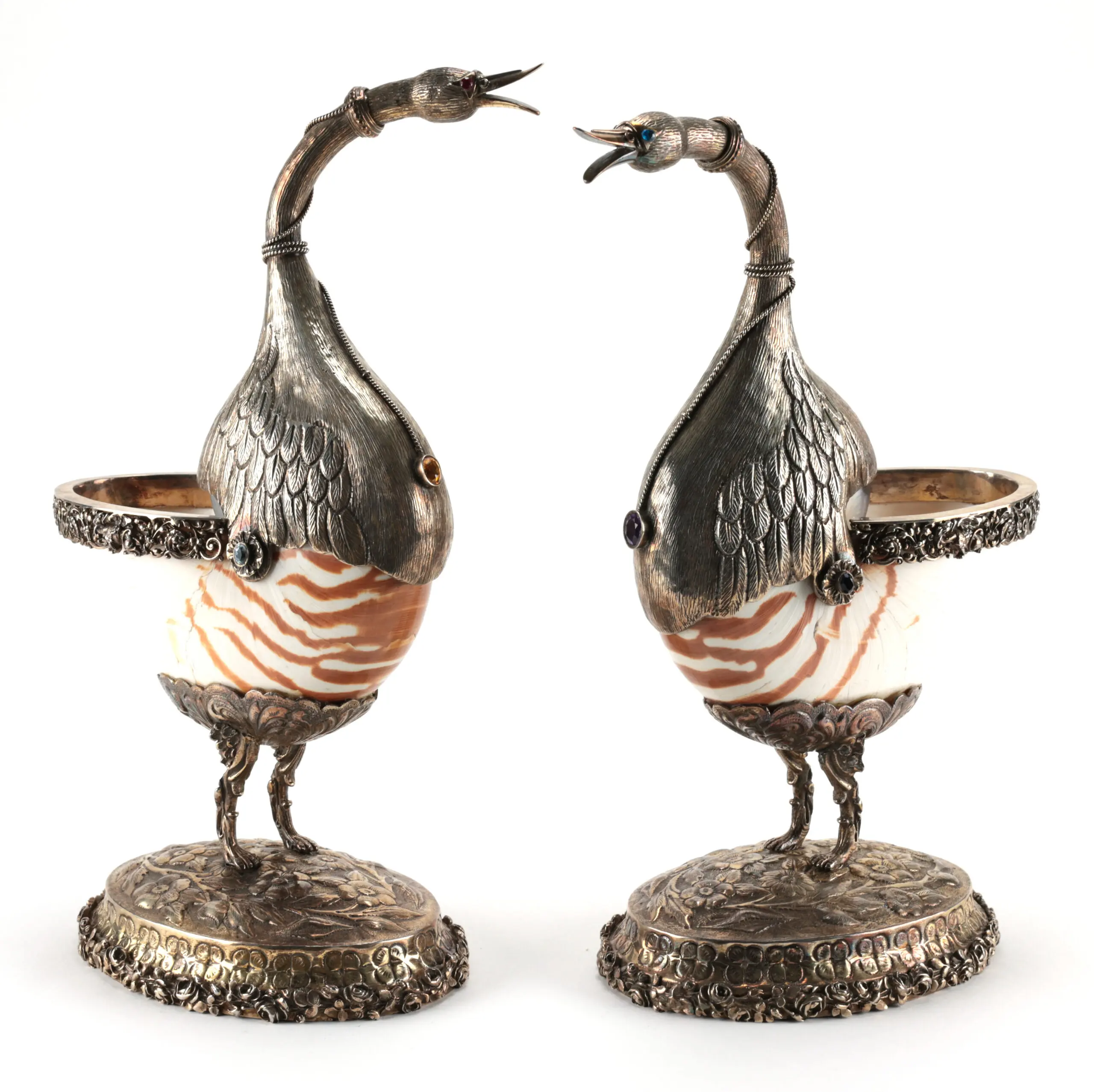 Deze spectaculaire en geheel originele set van twee zilveren tafelstukken (circa 1900) combineert naturalistische Hanau-zilversmeedkunst met de warme, golvende tekening van echte nautilusschelpen. De sculpturale zwanen, uitgevoerd door de gerenommeerde Gebrüder Dingeldein, behoren tot de meest verfijnde voorbeelden van Historismus-werk uit Hanau. Opvallend zijn de minutieuze graveerlijnen in de veren, de florale ciselering op de voet, en de gekleurde cabochons die de zwanen een levendige, bijna theatrale uitstraling geven.