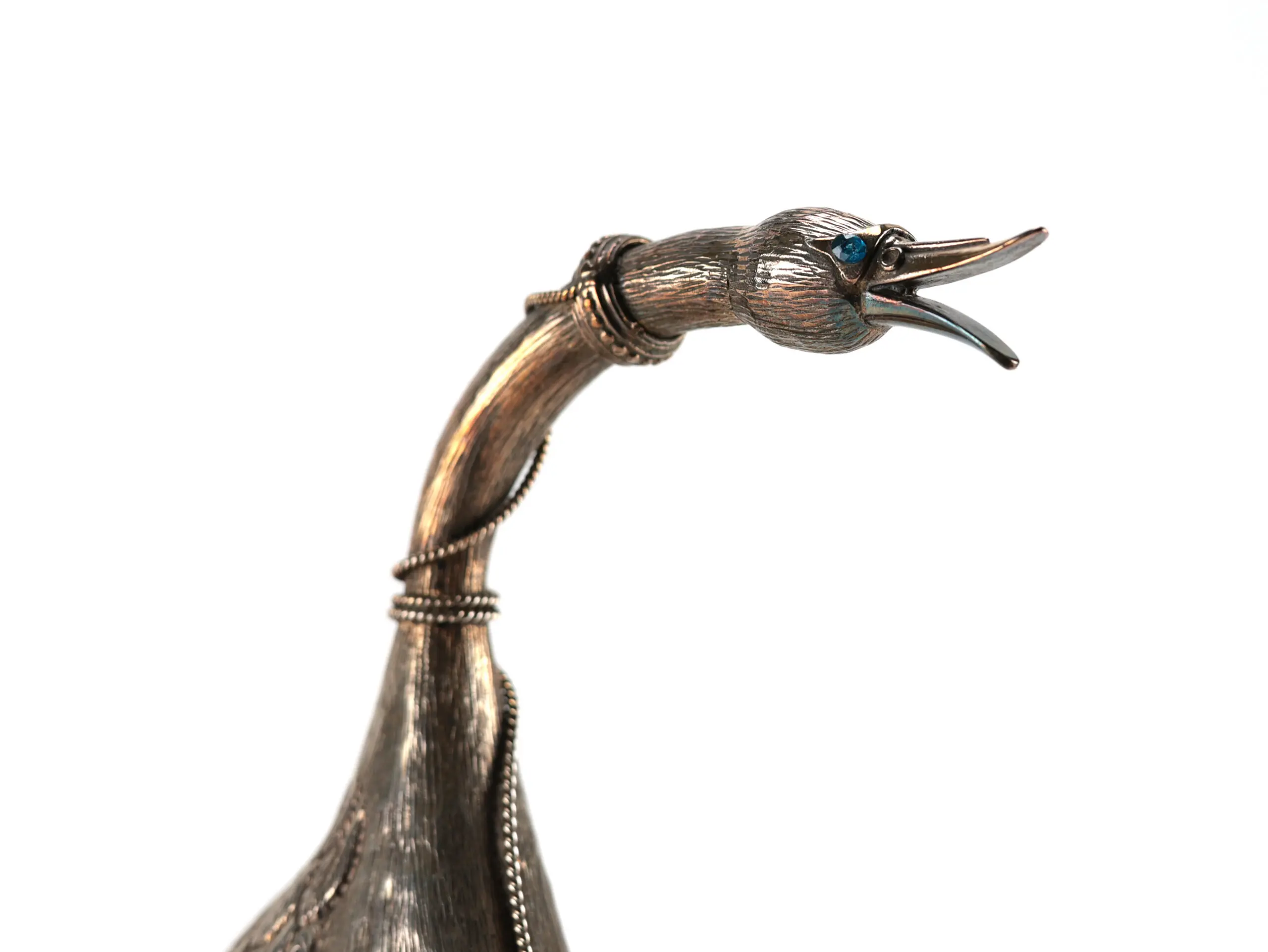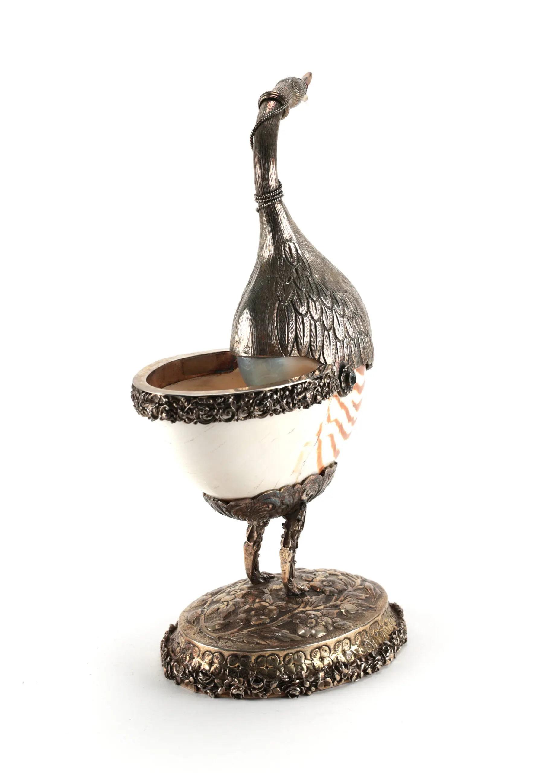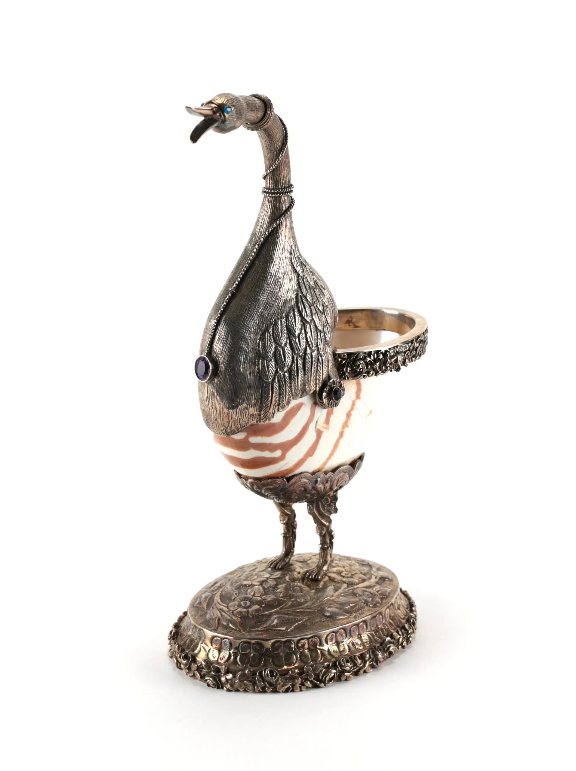Deze spectaculaire en geheel originele set van twee zilveren tafelstukken (circa 1900) combineert naturalistische Hanau-zilversmeedkunst met de warme, golvende tekening van echte nautilusschelpen. De sculpturale zwanen, uitgevoerd door de gerenommeerde Gebrüder Dingeldein, behoren tot de meest verfijnde voorbeelden van Historismus-werk uit Hanau. Opvallend zijn de minutieuze graveerlijnen in de veren, de florale ciselering op de voet, en de gekleurde cabochons die de zwanen een levendige, bijna theatrale uitstraling geven.