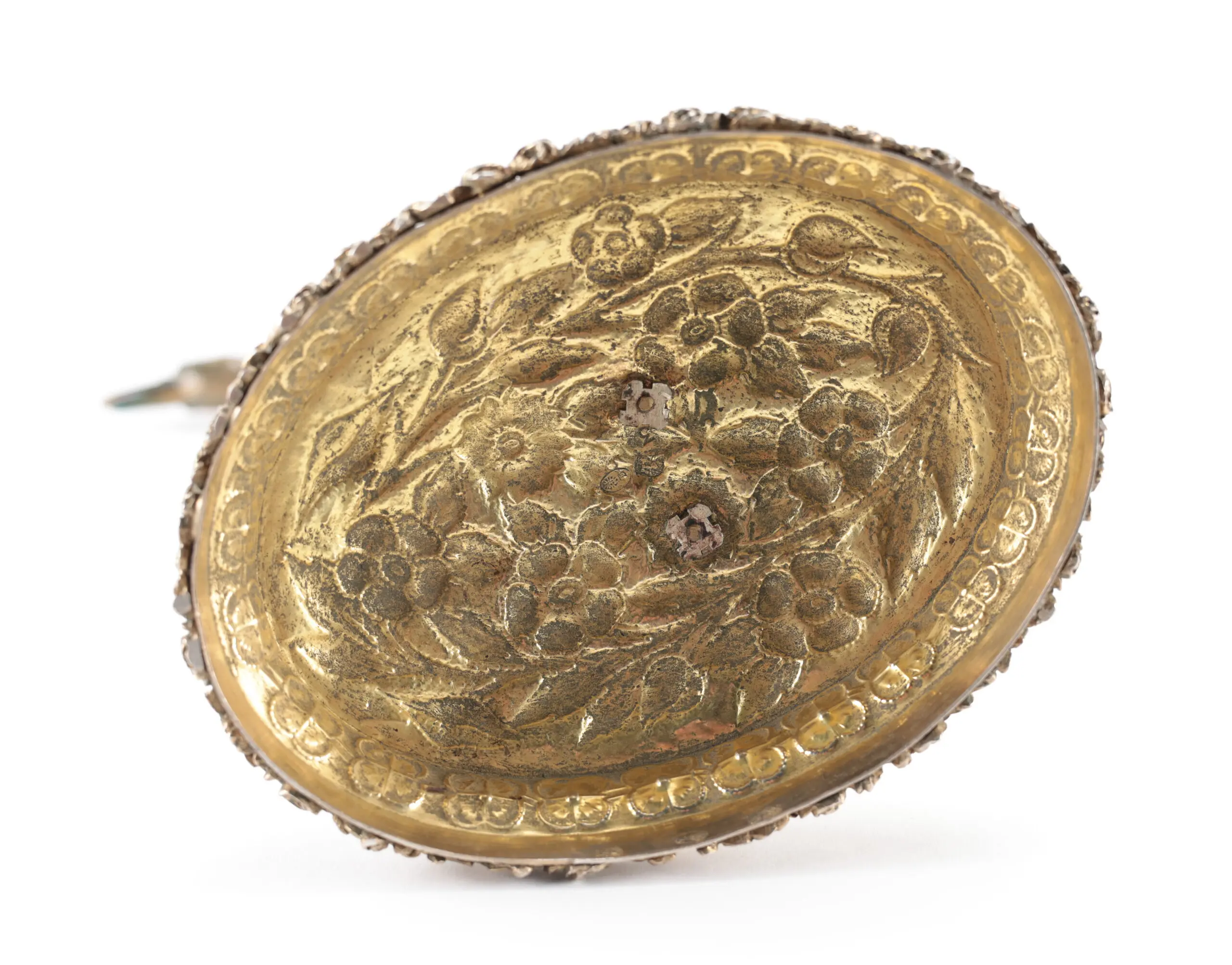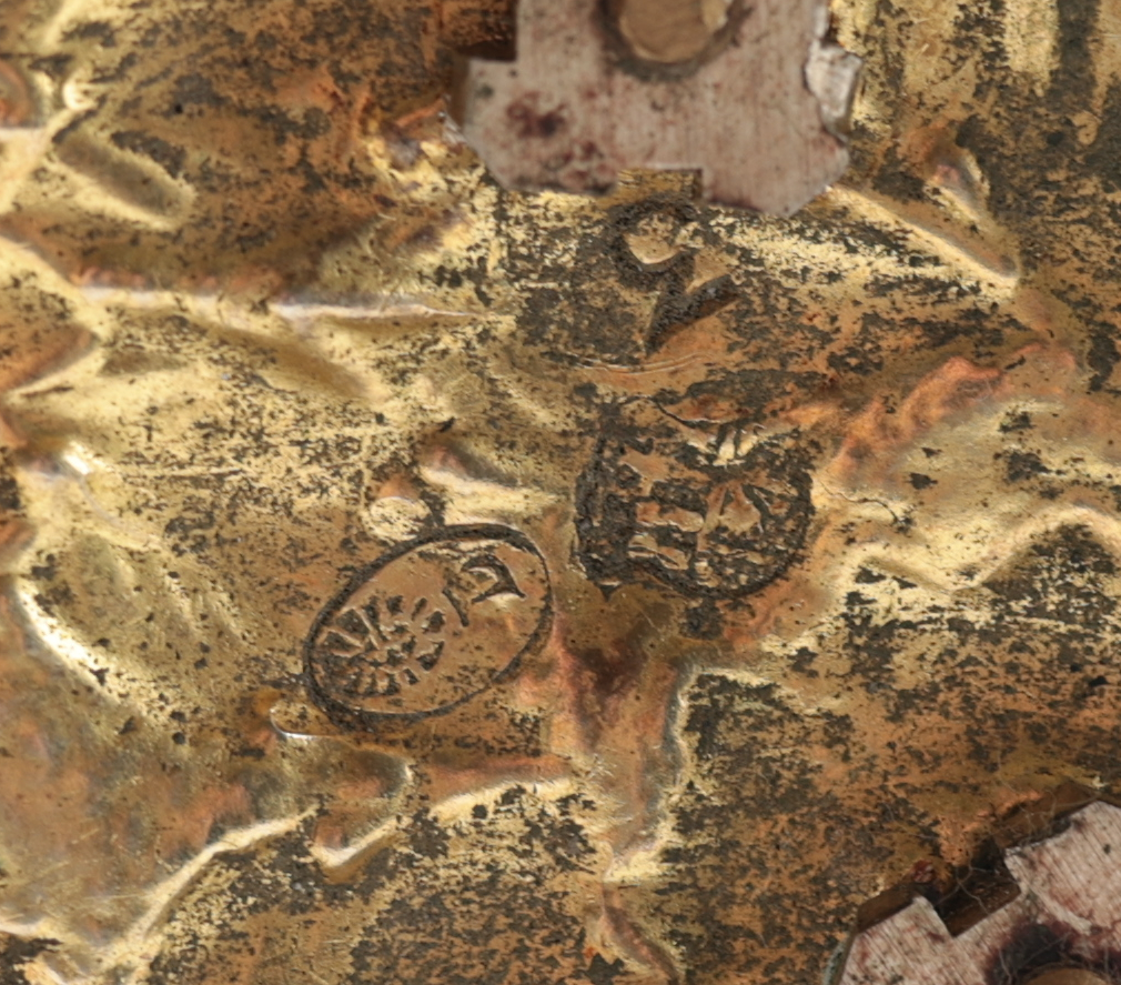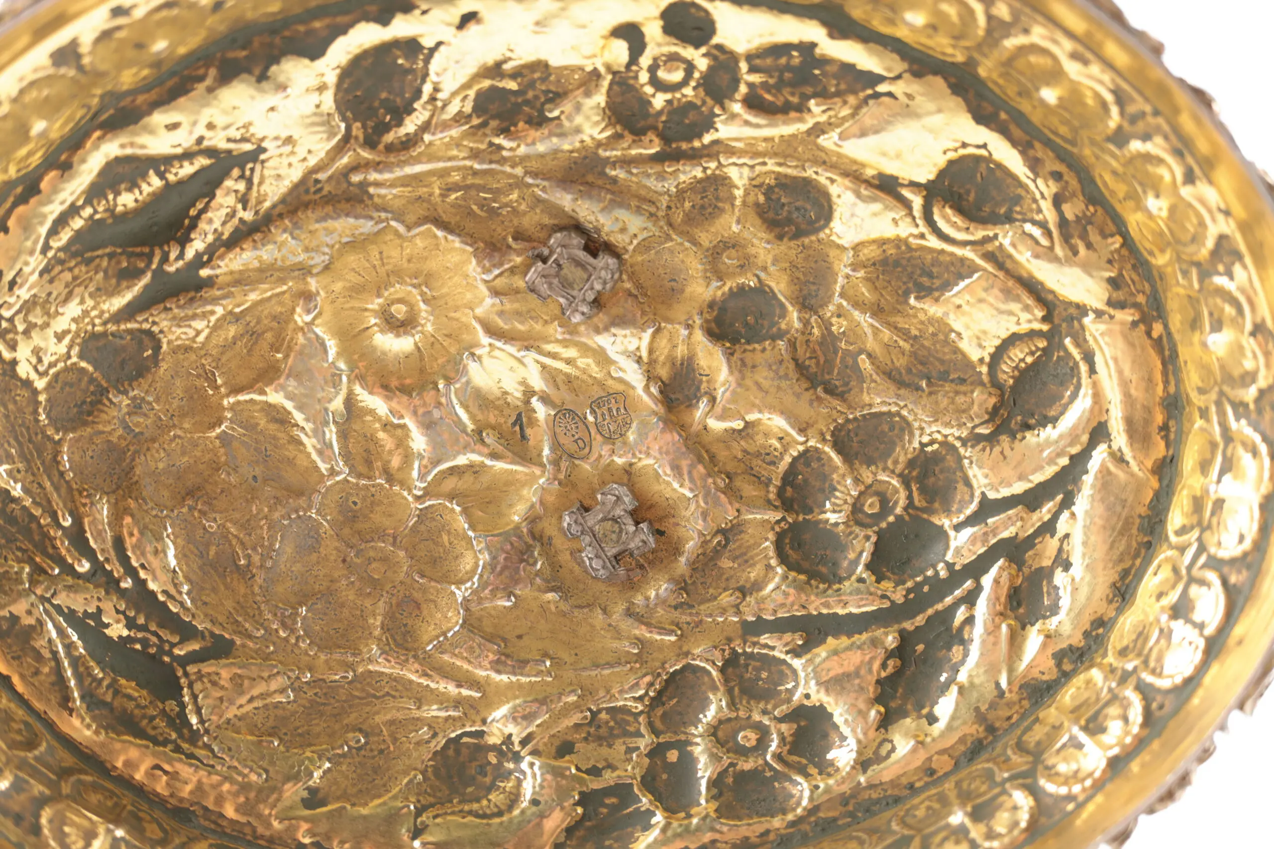 De nautilusschelpen zijn volledig intact met natuurlijke groeipatronen. De zilveren monturen zijn stabiel, rijk gedetailleerd en met mooie patina. Alle cabochons aanwezig. Originele vergulding aan de binnenzijde van de voetplaat met passende slijtage.