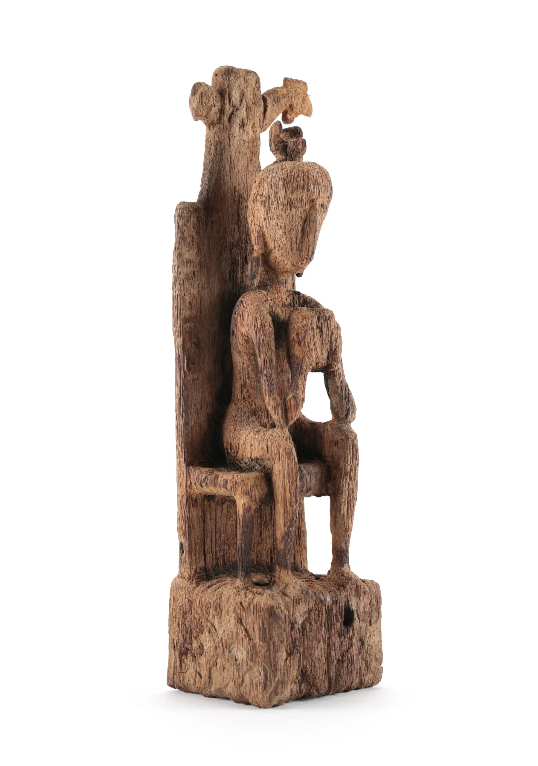 Dit indrukwekkende houten voorouderbeeld toont een zittende figuur met ingetogen gelaatsuitdrukking en fijn uitgewerkte details, waaronder oorhangers en een karakteristieke haarbundel. De figuur houdt een offerkom of attribuut in beide handen, zittend op een troonvormige basis met uitgesneden rugpaneel. De verweerde, open structuur van het hout en de diepe, natuurlijke patina duiden op aanzienlijke ouderdom en langdurig ritueel gebruik.